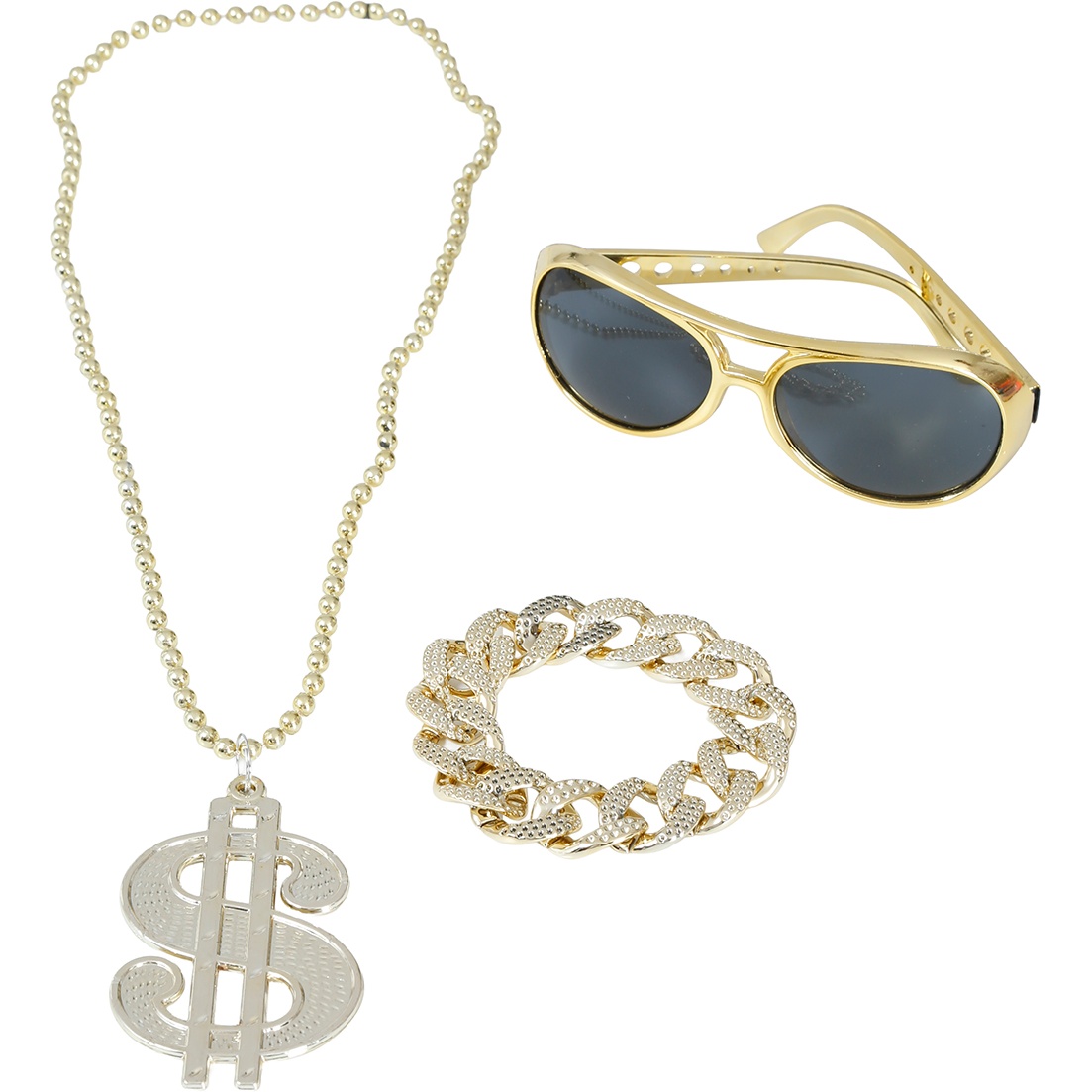 Set 'Hip-Hop-König' - entwickelt, damit Sie bei Kostümen und Motto-Partys auffallen. Goldfarbene Optik und markanter Stil, der den klassischen urbanen Hip-Hop-Look wiedergibt; ideal für Karneval, Junggesellenabschiede und Photocalls. Verleihen Sie Ihrem Outfit einen extravaganten, unterhaltsamen Akzent - konzipiert für den gelegentlichen Einsatz bei Veranstaltungen für Erwachsene.