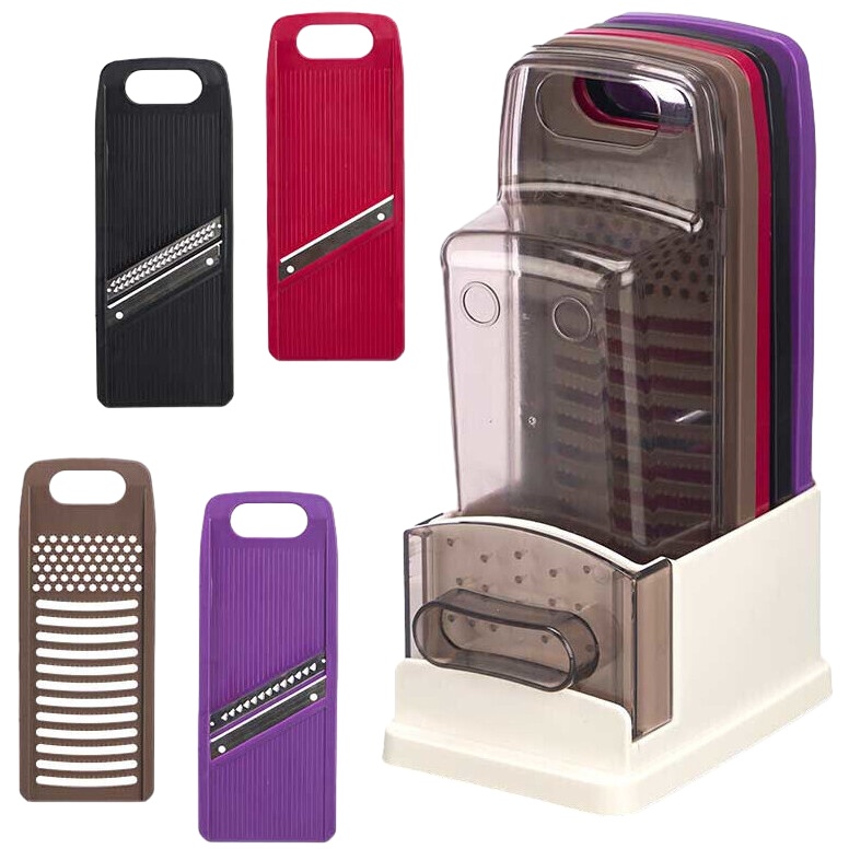 • Enthält verschiedene Arten von Reiben und eine Halterung zur organisierten Aufbewahrung.