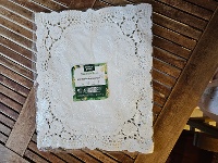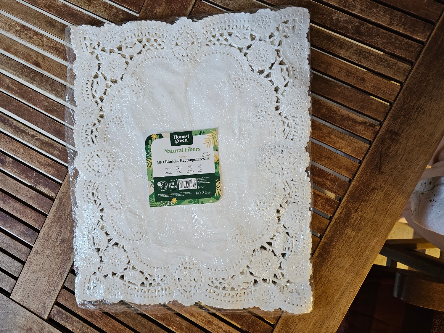 Rechteckige Papierdeckchen mit schönem, ausgestanztem geometrischen Randdesign, das die Präsentation Ihrer Produkte auf dem Tisch elegant unterstreichen wird.