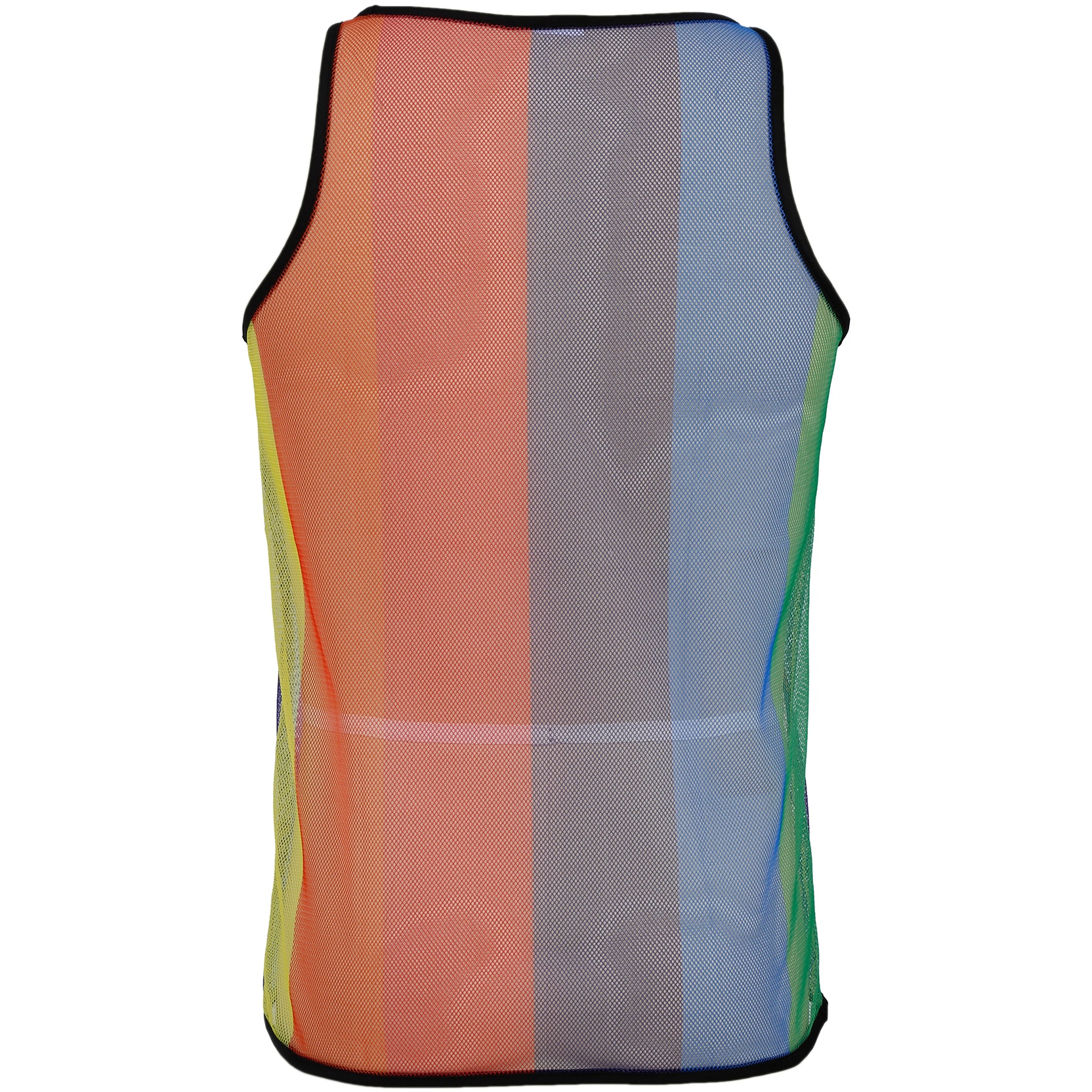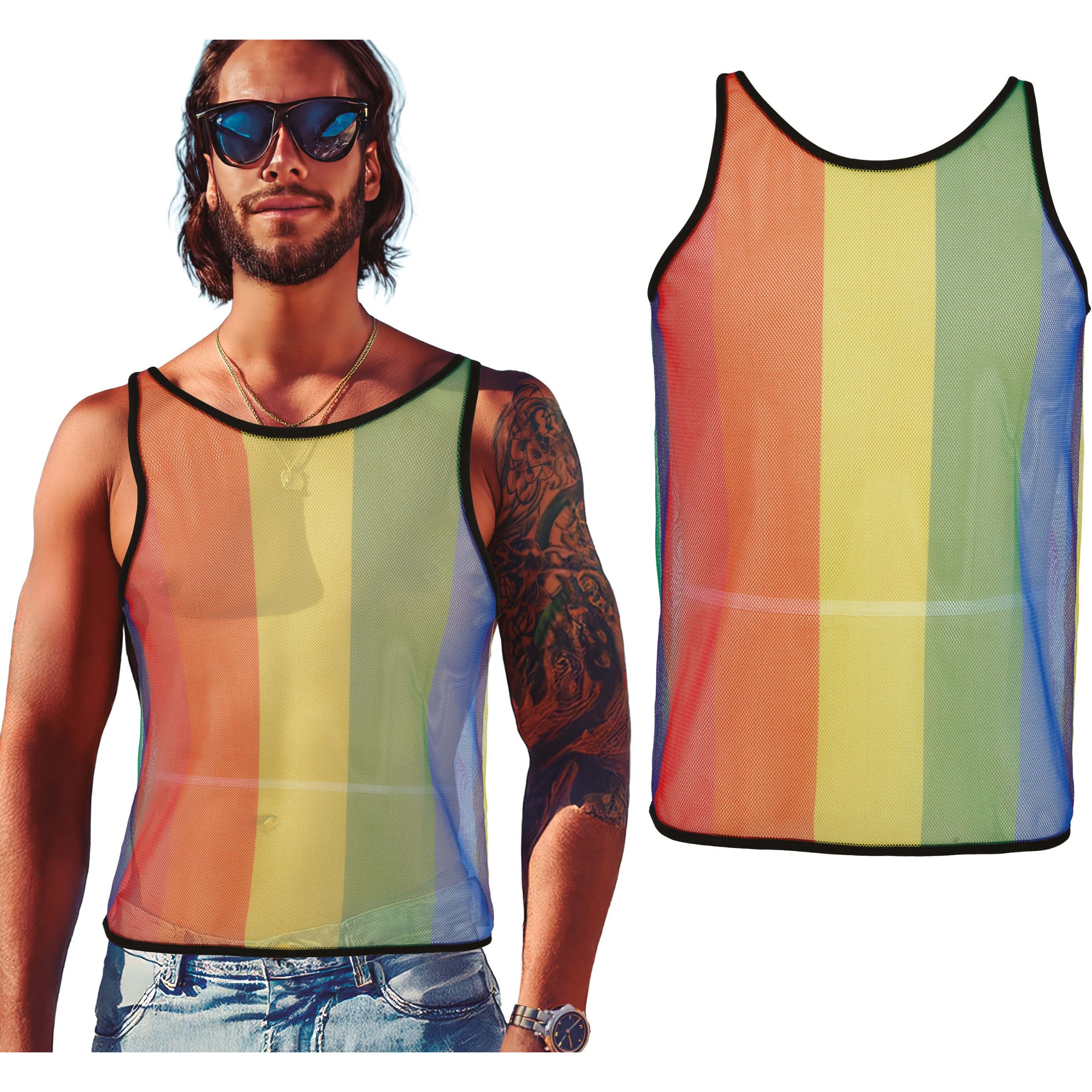 Netztop mit Regenbogenstreifen - perfekt, damit Sie bei Pride-Veranstaltungen und Paraden herausstechen. Das leichte Polyester-Netzgewebe ist besonders atmungsaktiv und lässt sich solo oder als Lage über anderen Kleidungsstücken tragen. Der Unisex-Schnitt für Erwachsene passt zu verschiedenen Stilrichtungen. Auffälliges, farbenfrohes Design für kreative und festliche Looks.