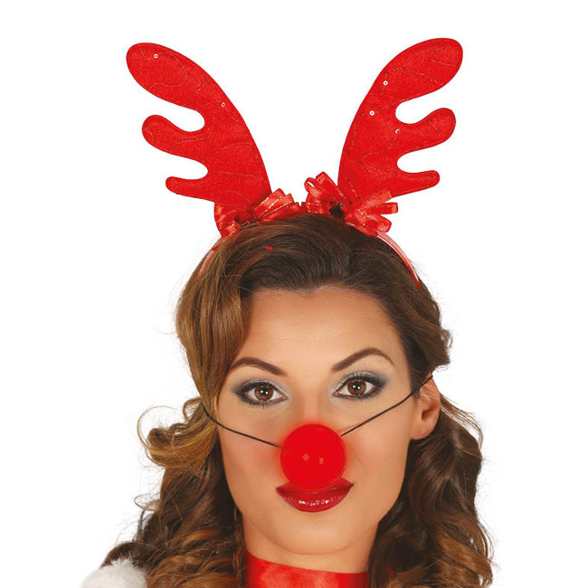 Rentier-Set bestehend aus einem Stirnband aus Filz und einer roten Kunststoffnase, die leuchtet.