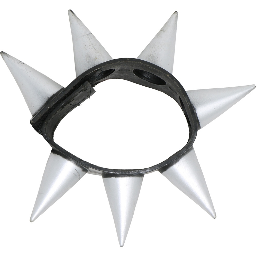 Punk-Armband aus flexiblem, schwarzem Kunststoff mit silberfarbenen Spikes entlang des Armbands. Es hat einen Klettverschluss, der eine bessere Anpassung an die Größe des Handgelenks ermöglicht.