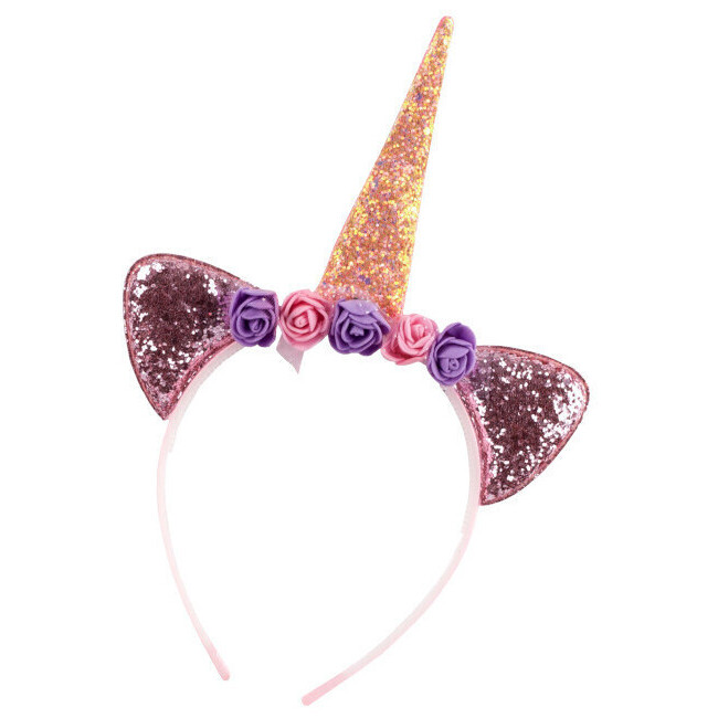 Rosa Einhorn-Stirnband mit Ohren und Blumen.