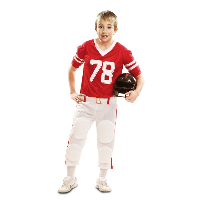 Authentisches Rugbyspieler-Kostüm, bestehend aus einem roten, kurzärmeligen T-Shirt mit der Nummer des Spielers in großem Druck auf der Brust und einer weißen Hose. Sowohl das Hemd als auch die Hose haben gepolsterte Schulter- und Beinprotektoren.