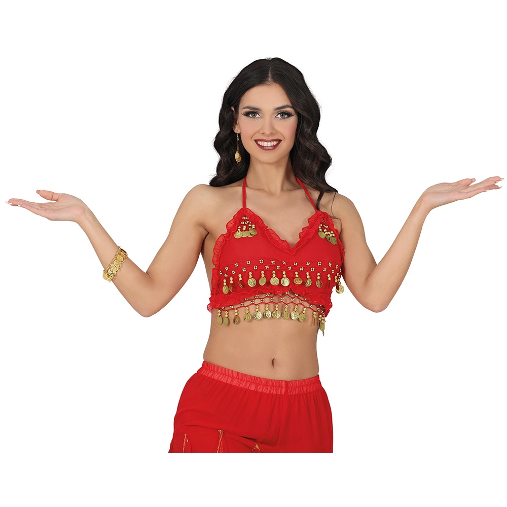 Dieses rote Bauchtanz-Top ist mit goldenen Münzverzierungen versehen, die bei jeder Bewegung funkeln und klirren. Der kurze, feminine Schnitt ist ideal für Auftritte, Unterricht und Mottopartys. Feine, verstellbare Träger betonen das Dekolleté und bieten zugleich volle Bewegungsfreiheit für Ihre Choreografien. Perfekt, um Ihrem Karnevals- oder Showoutfit einen exotischen Akzent zu verleihen.