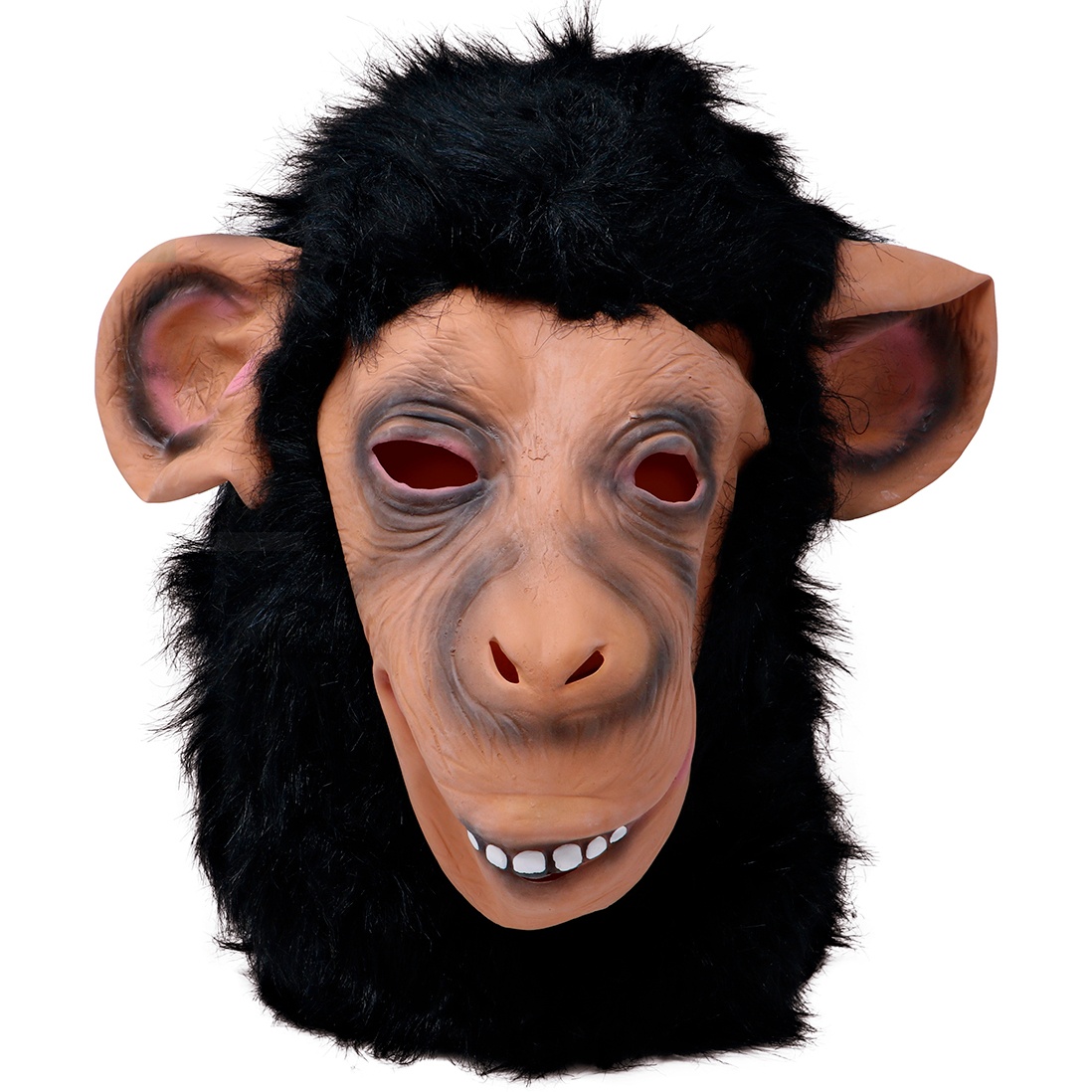 Schimpansen- oder Affenmaske mit großen Ohren und schwarzen Haaren. Die Maske bedeckt den ganzen Kopf, so dass niemand Sie erkennen kann.