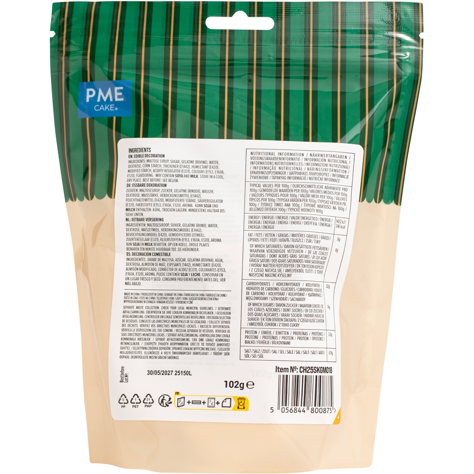 Zutaten: Maltosesirup, Zucker, Gelatine (Rind), Wasser, Dextrose, Maisstärke, Verdickungsmittel (1442), Feuchthaltemittel (E420), modifizierte Stärke, Säureregulator (E331), Farbstoffe (E153, E160A, E120), Aroma.