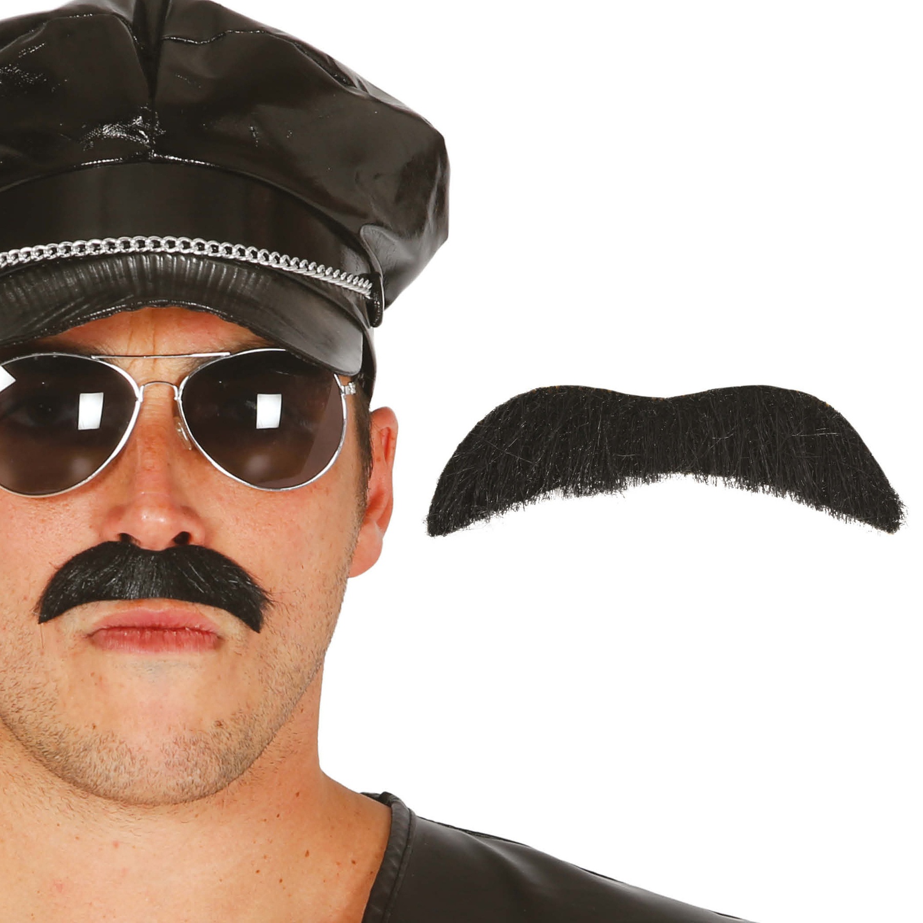 Der Schnurrbart besteht aus kurzen schwarzen Haaren mit einer abgerundeten Form, die sich der Form der Lippe anpasst. Der Schnurrbart ist mit einem Aufkleber befestigt, um ihn zu fixieren.