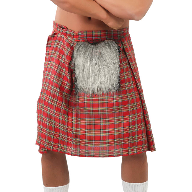 Dieser Kilt ist mit einem dekorativen roten Karomuster mit weißen und grauen Linien versehen. Oben ist er mit einer grauen Pelztasche versehen. Dank der Klettverschlüsse und des elastischen Bunds ist er leicht verstellbar.