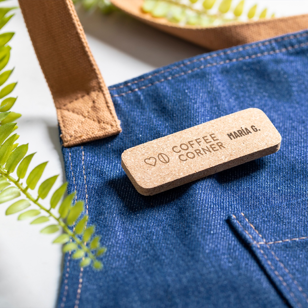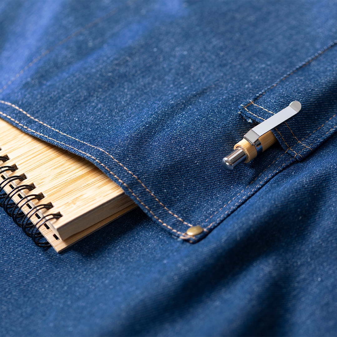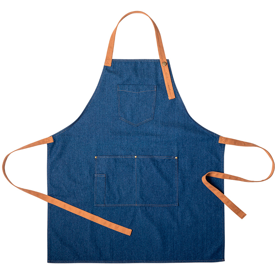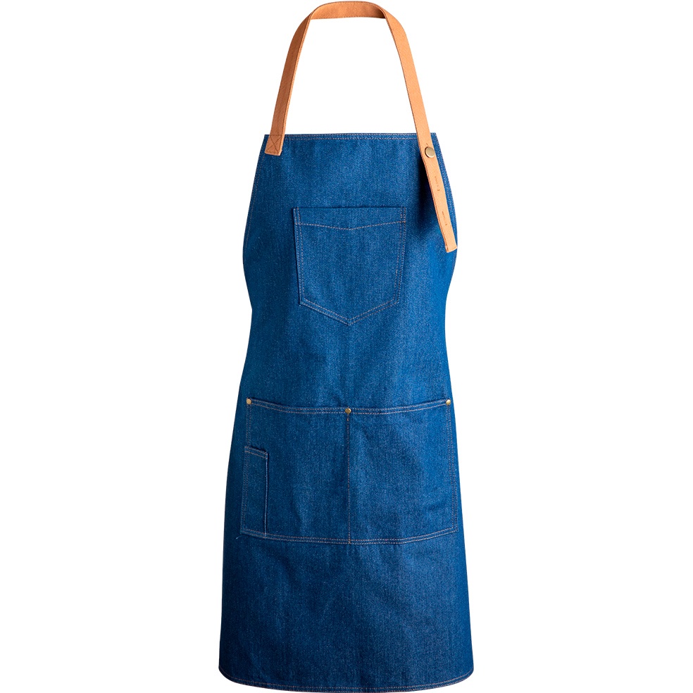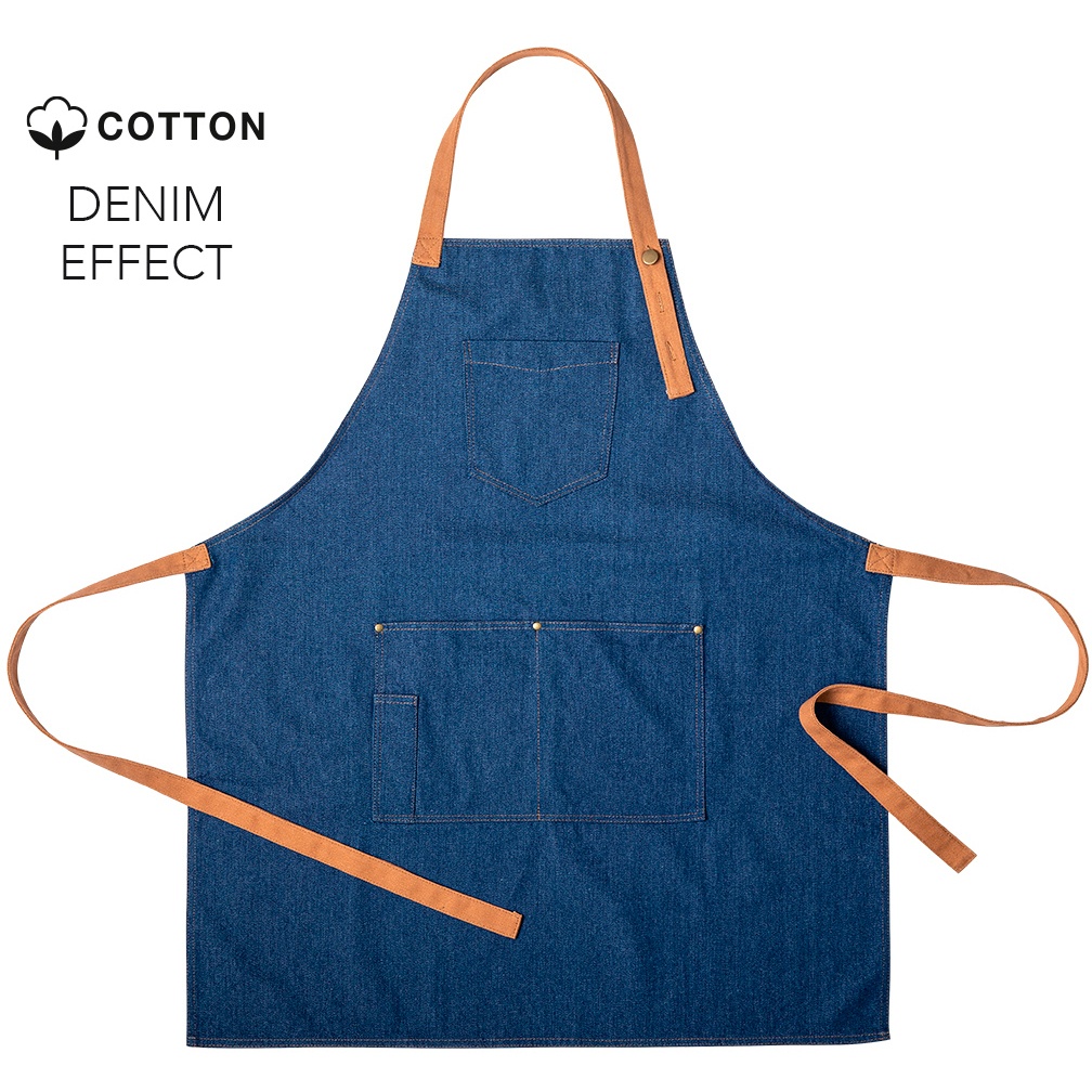 - Hochwertige Schürze aus robustem Denim-Stoff.