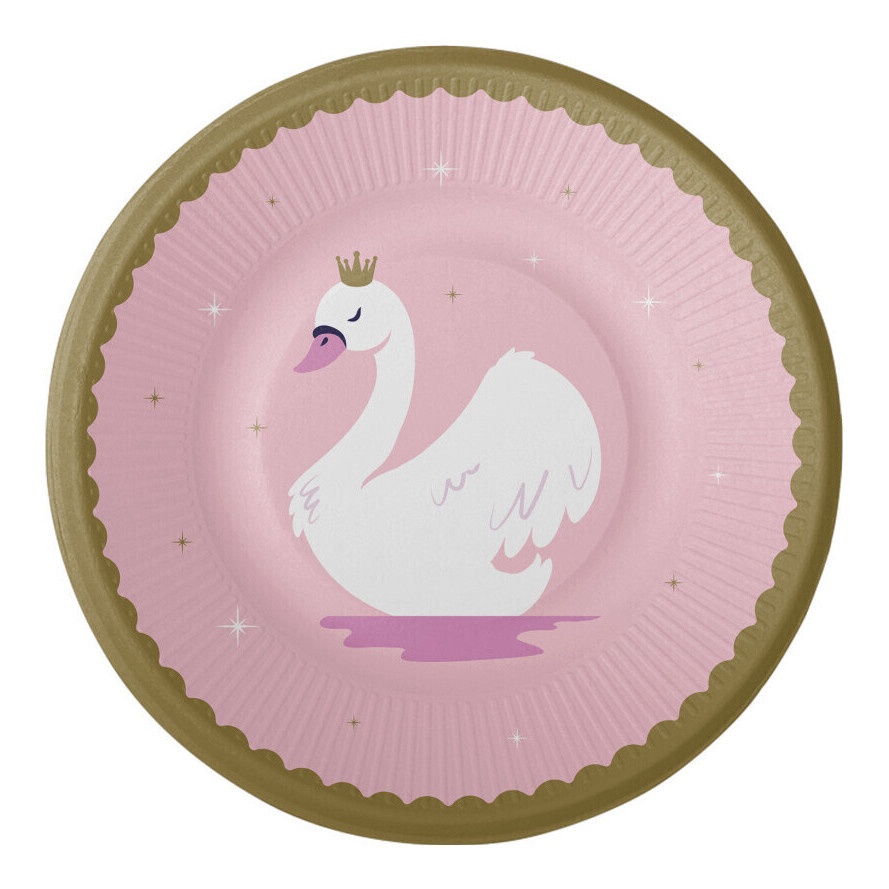 Satz von 8 rosa Tellern mit einem schönen Schwan in der Mitte. Der Rand ist golden, ebenso wie die Sterne im Hintergrund und die Krone des Schwans.