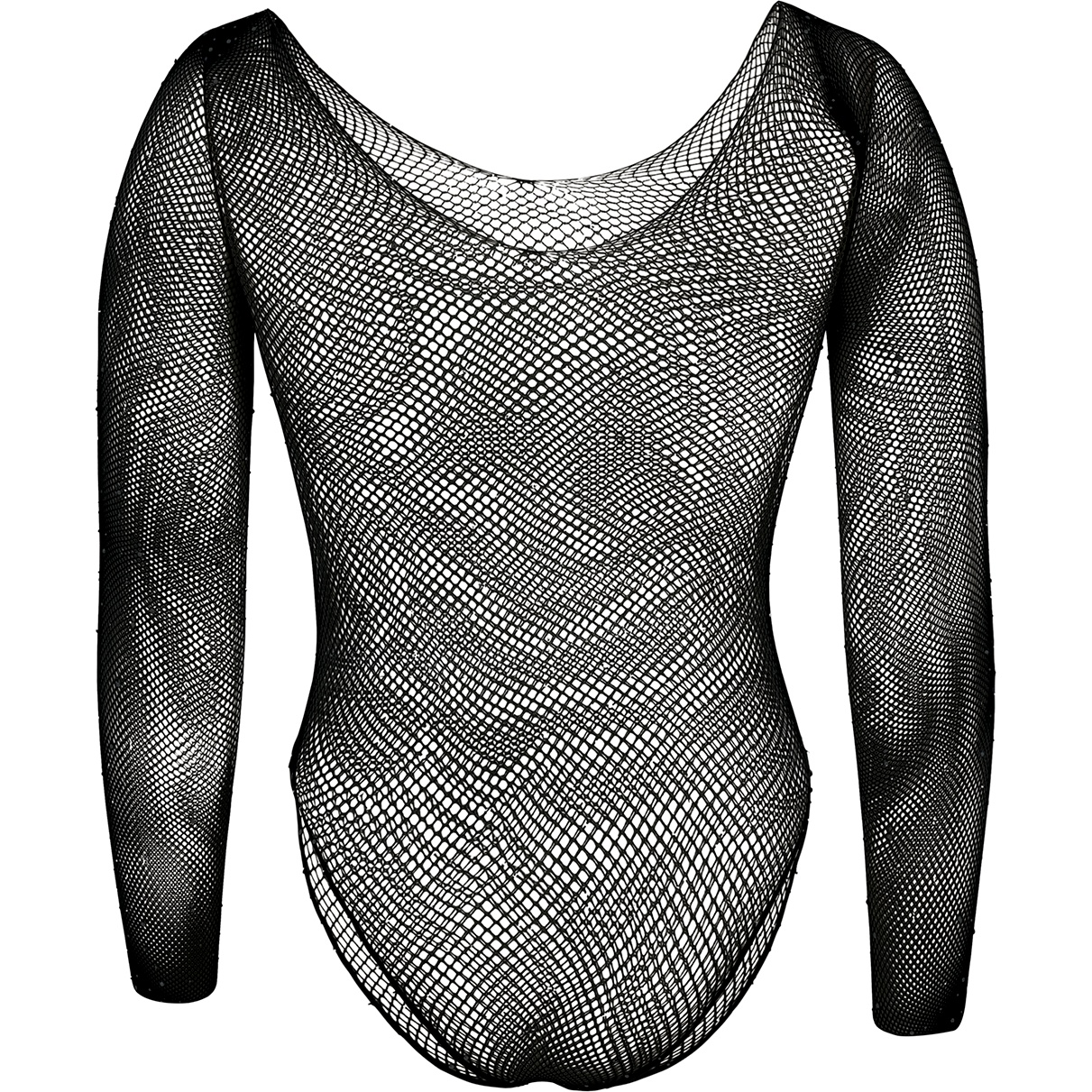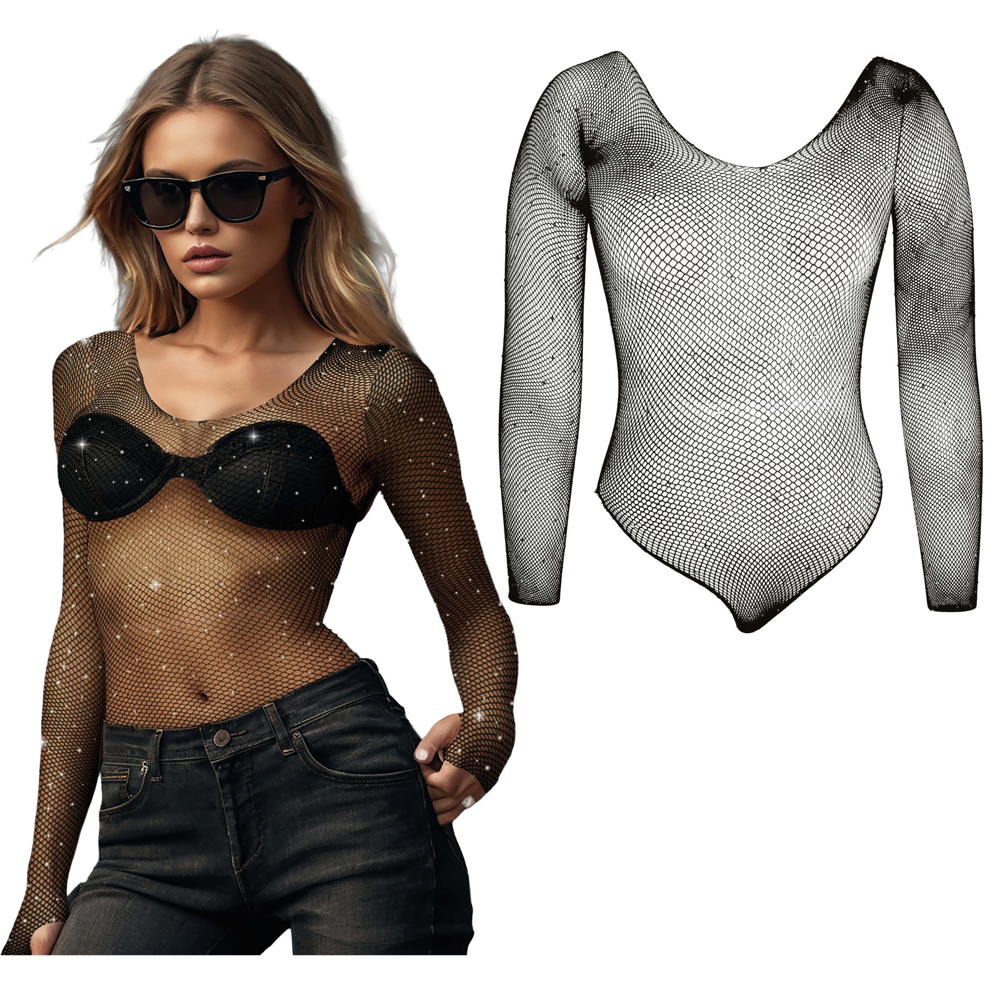 Schwarzer Mesh-Body mit funkelnden Strassapplikationen - entwickelt für Abendlooks und Club-Atmosphäre. Der figurbetonte Schnitt und die langen Ärmel erzeugen eine elegante, sinnliche Silhouette; die kontrollierte Transparenz setzt Ihr Outfit wirkungsvoll in Szene. Perfekt kombinierbar mit Bralette, Jeans, Rock oder Shorts, um mutige, moderne Styles zu kreieren. Aus Elastan und Polyamid gefertigt für eine bequeme, flexible Passform, die sich Ihrem Körper anpasst.