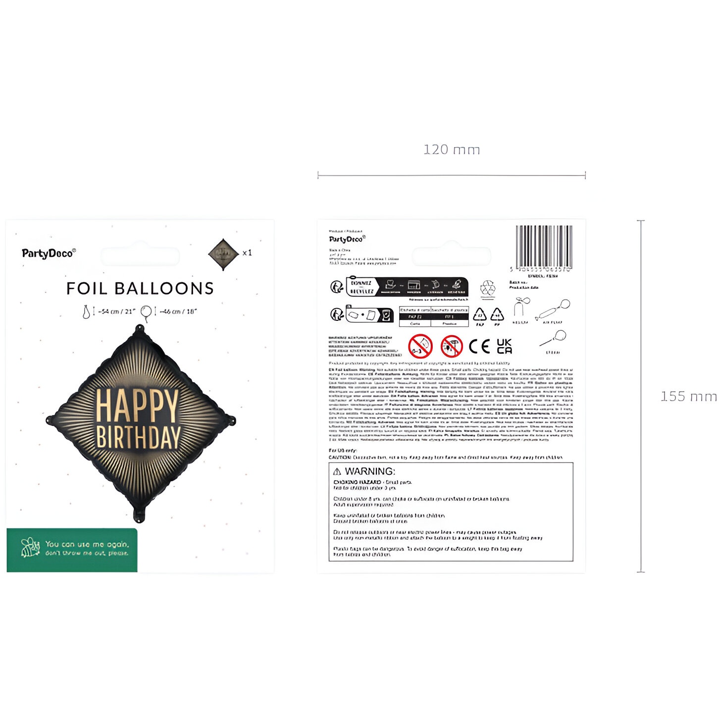 Schwarzer Folienballon mit goldener Aufschrift 'Happy Birthday', der Ihrer Geburtstagsdekoration für Erwachsene eine raffinierte, glänzende Note verleiht. Das metallische Finish sorgt für einen eleganten Lichtreflex und lässt sich hervorragend mit Arrangements in Schwarz, Gold und neutralen Tönen kombinieren. Für Helium- oder Luftbefüllung geeignet - flexibel einsetzbar, ob schwebend oder als Teil von Tischdekorationen. Maße vor dem Befüllen ca. 54 x 54 cm, nach dem Befüllen ca. 46 x 46 cm; ideal, um bei jeder Festdekoration Akzente zu setzen.