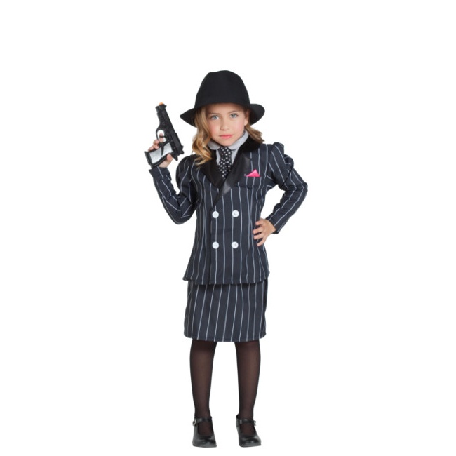 Dieses Gangsterkostüm für Mädchen besteht aus einem niedlichen Set aus Jacke und Rock mit weißem Nadelstreifendesign. Der Rock lässt sich durch einen Reißverschluss auf der Rückseite verstellen.