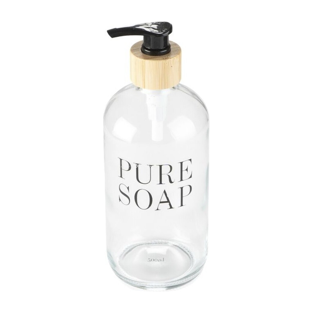 • Elegantes Design aus klarem Glas mit der Aufschrift 'PURE SOAP'.