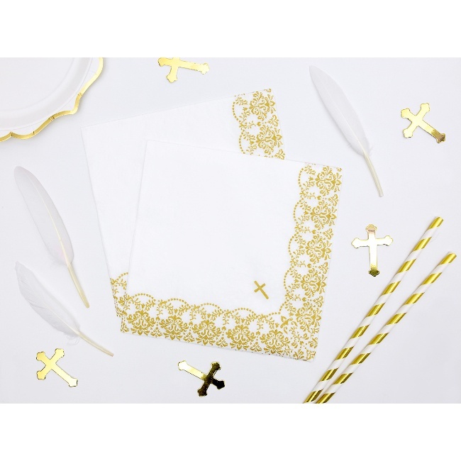 Set von 20 weißen, 3-lagigen Servietten, mit verzierten Rändern in Goldtönen und mit einem lateinischen Kreuz an jeder Ecke, auch in Silberfarbe erhältlich.