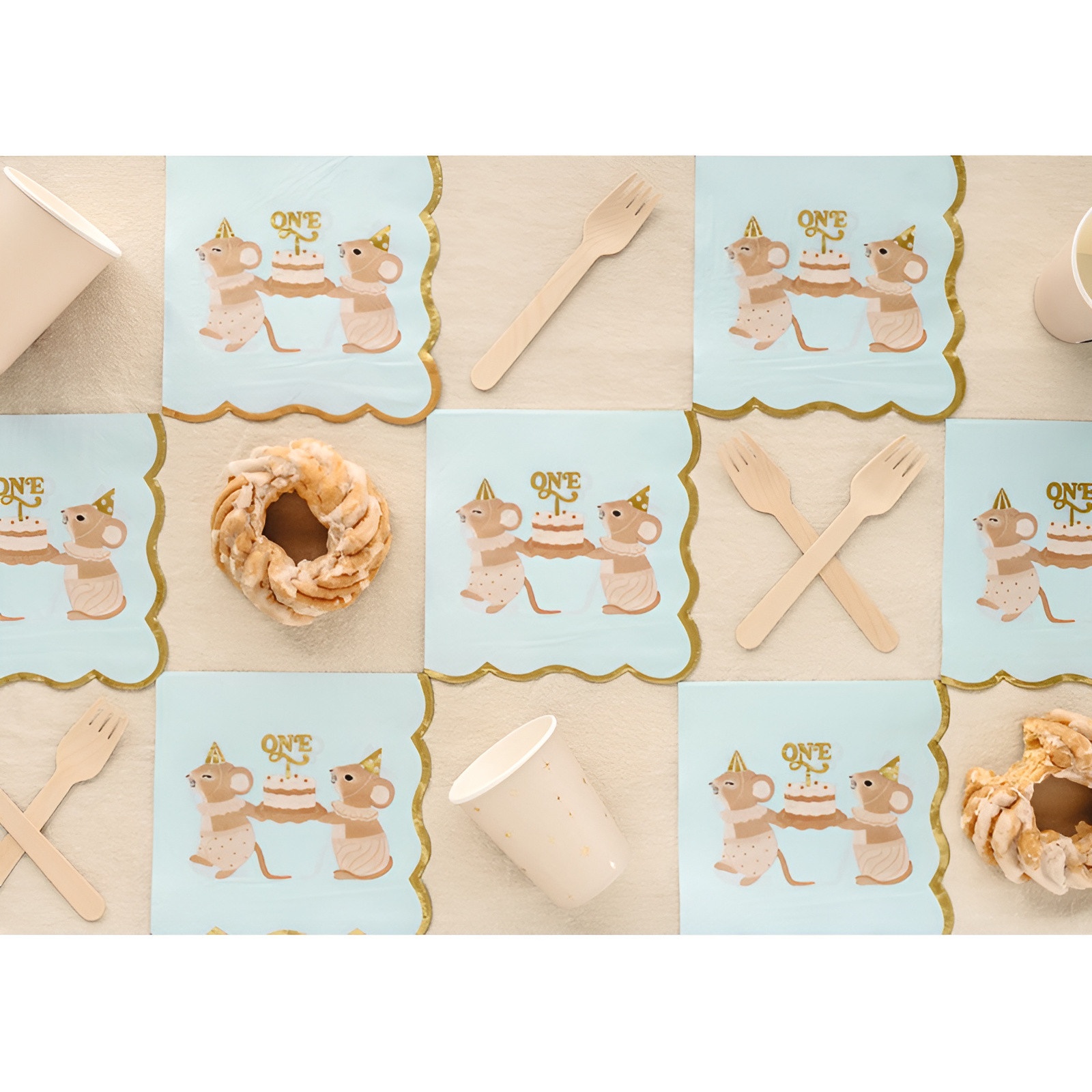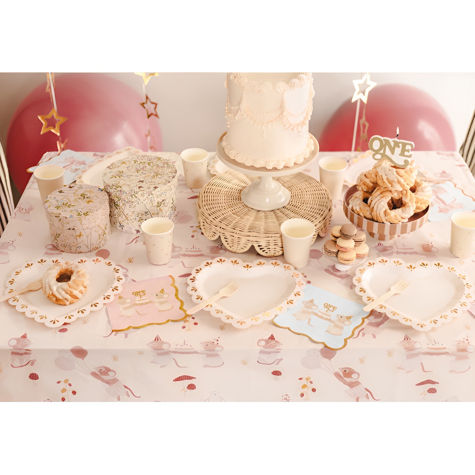 • Kindlicher Charme: Illustration mit Mäuschen und dem Schriftzug "ONE" - ideal, um Ihren Tisch zum ersten Geburtstag stilvoll zu gestalten.