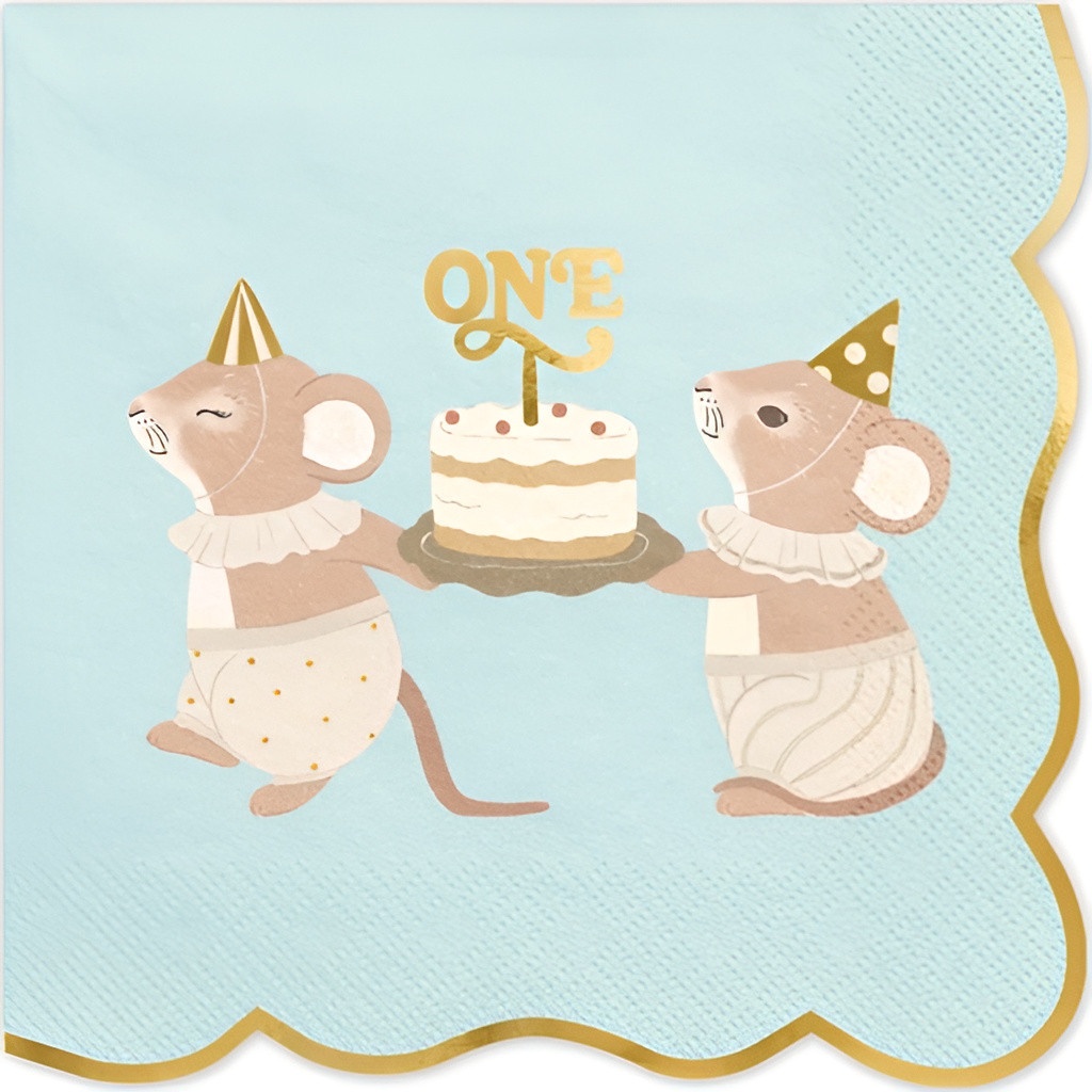 Zweilagige Papierservietten mit einem zarten Mäusemotiv und dem Schriftzug "ONE" auf blauem Hintergrund. Maße: aufgeklappt 33 x 33 cm, gefaltet 16,5 x 16,5 cm. Süßes, elegantes Design - perfekt, um den ersten Geburtstag stilvoll zu feiern. Praktisch verpackt im kompakten Beutel, ideal zum Dekorieren Ihres Tisches und zur Kombination mit der restlichen Party-Papeterie.
