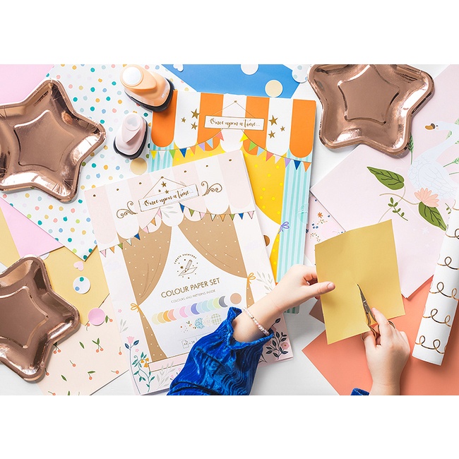 Packung mit 34 sortierten bunten und gemusterten Bögen im DIN A4-Format, mit denen Kinder beim Basteln Spaß haben können.