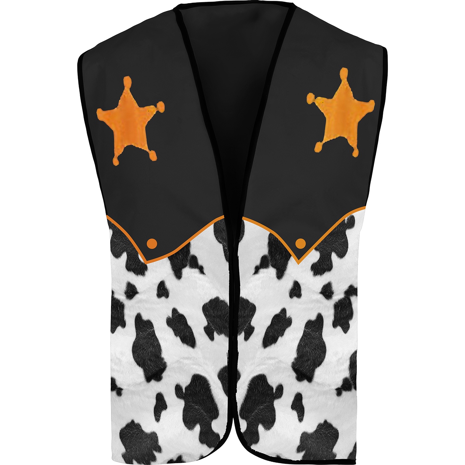 Sheriff-Weste im klassischen Cowboy-Design: schwarzer Oberbereich mit Sheriff-Sternen und unterer Bereich mit Kuhfleckenmuster. Sie verleiht jedem Western-Look eine spielerische, gut erkennbare Note. Gefertigt aus leichtem Polyester für erhöhten Tragekomfort und Bewegungsfreiheit, lässt sich die Weste unkompliziert über der Kleidung tragen und passt ideal zu Hut und weiteren Cowboy-Accessoires. Speziell für Kinder entworfen - auffällig und praktisch für Partys und Karneval; ein schönes Kostümaccessoire, mit dem Sie das Outfit Ihres Kindes komplettieren.