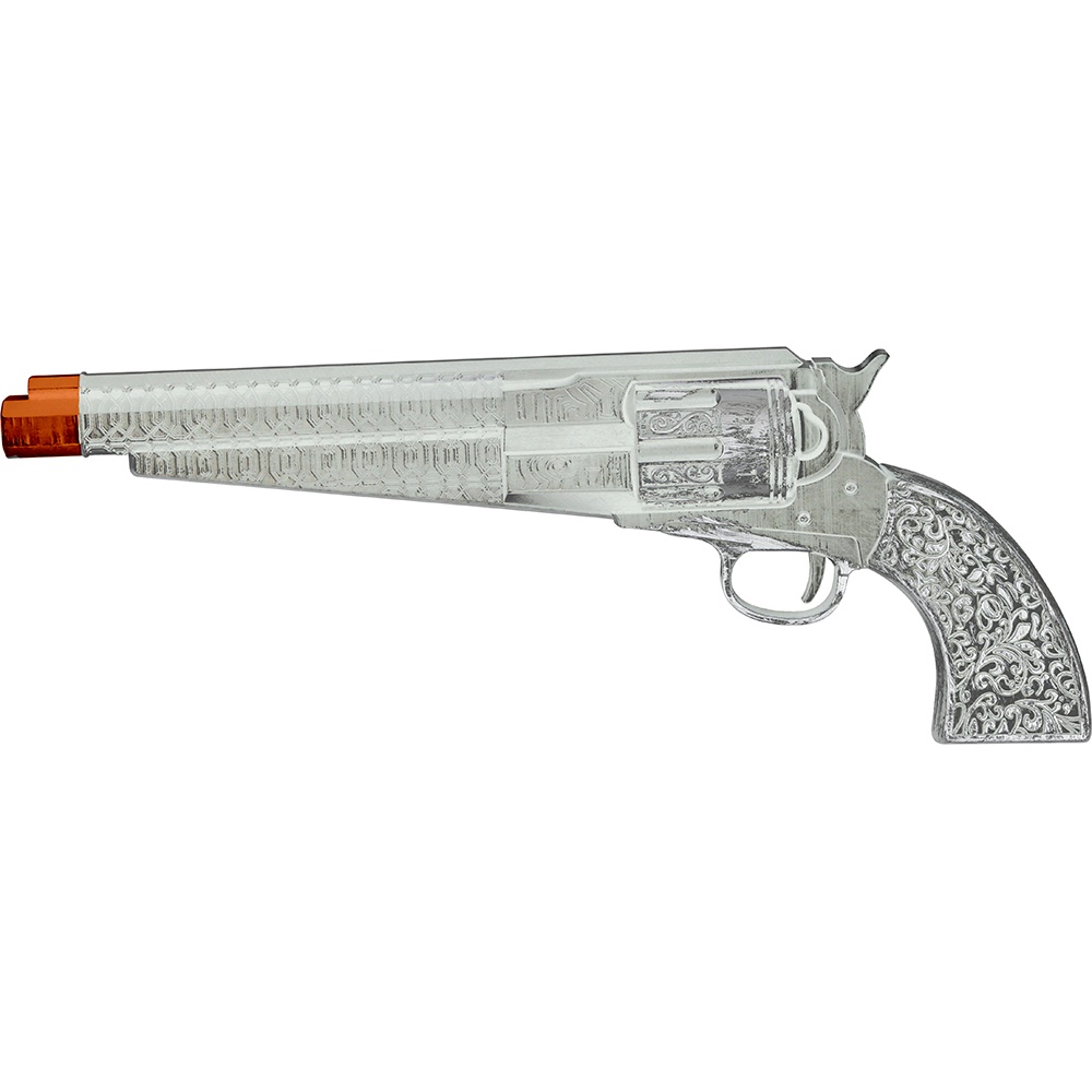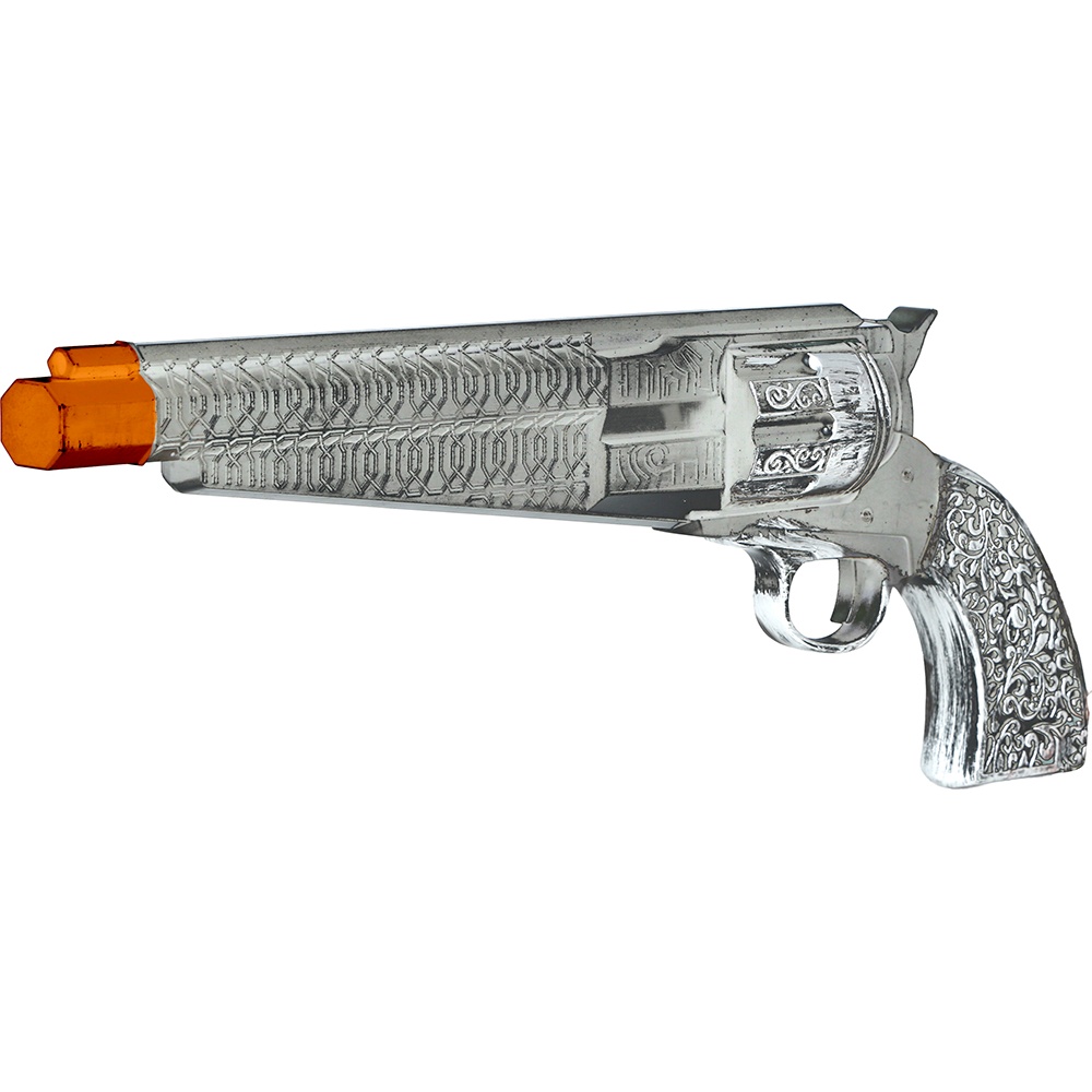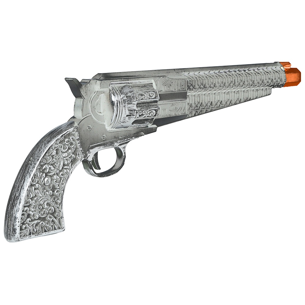 Spielzeugpistole mit silbernem Finish und klassischem Cowboy-Design, entwickelt, um Ihr Kostüm und Ihre Rollenspiele zu vervollständigen. Sie misst etwa 30 cm und besteht aus leichtem PVC, das einen eindrucksvollen Look ohne Gewicht liefert. Die deutlich sichtbare orangefarbene Sicherheitsspitze sorgt für einen sicheren Einsatz bei Partys und Veranstaltungen.