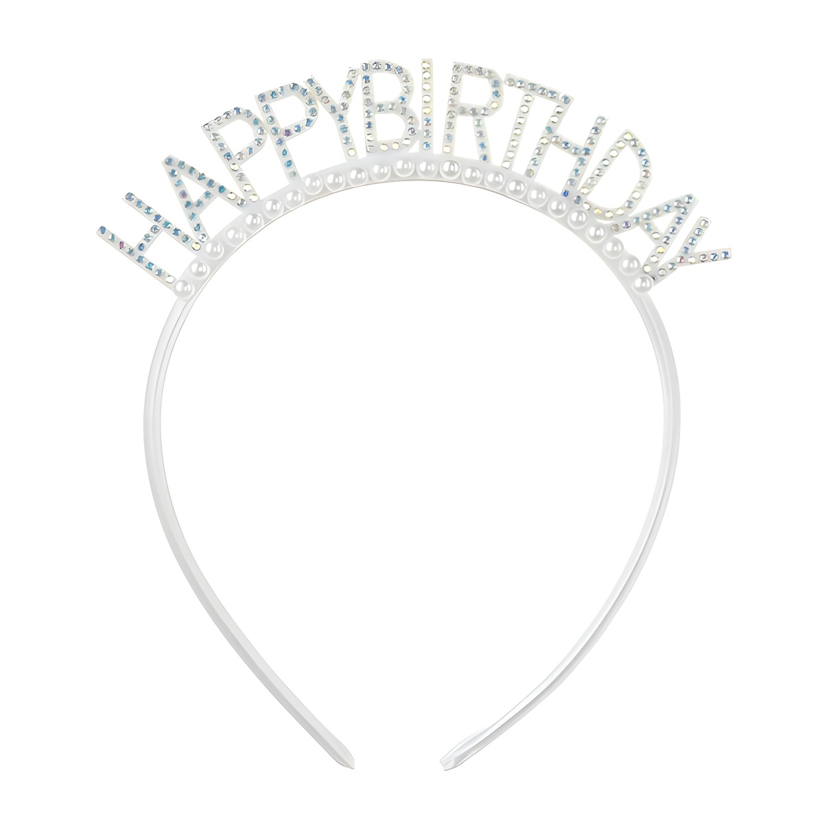 Festliches Diadem mit der Aufschrift "Happy Birthday" in Silberoptik, verziert mit dekorativen Perlen und funkelnden Details.