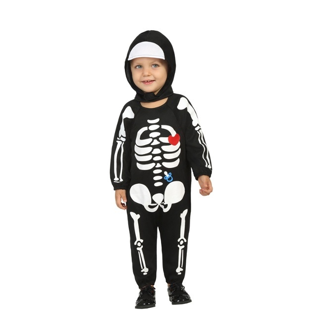 Es ist ein schwarzer Overall mit einer weißen Abbildung der Knochen, aus denen das menschliche Skelett besteht. Es wird mit einem kleinen roten Herz und einem blauen Schnuller geliefert, um dem Kostüm einen lässigen Touch zu verleihen.