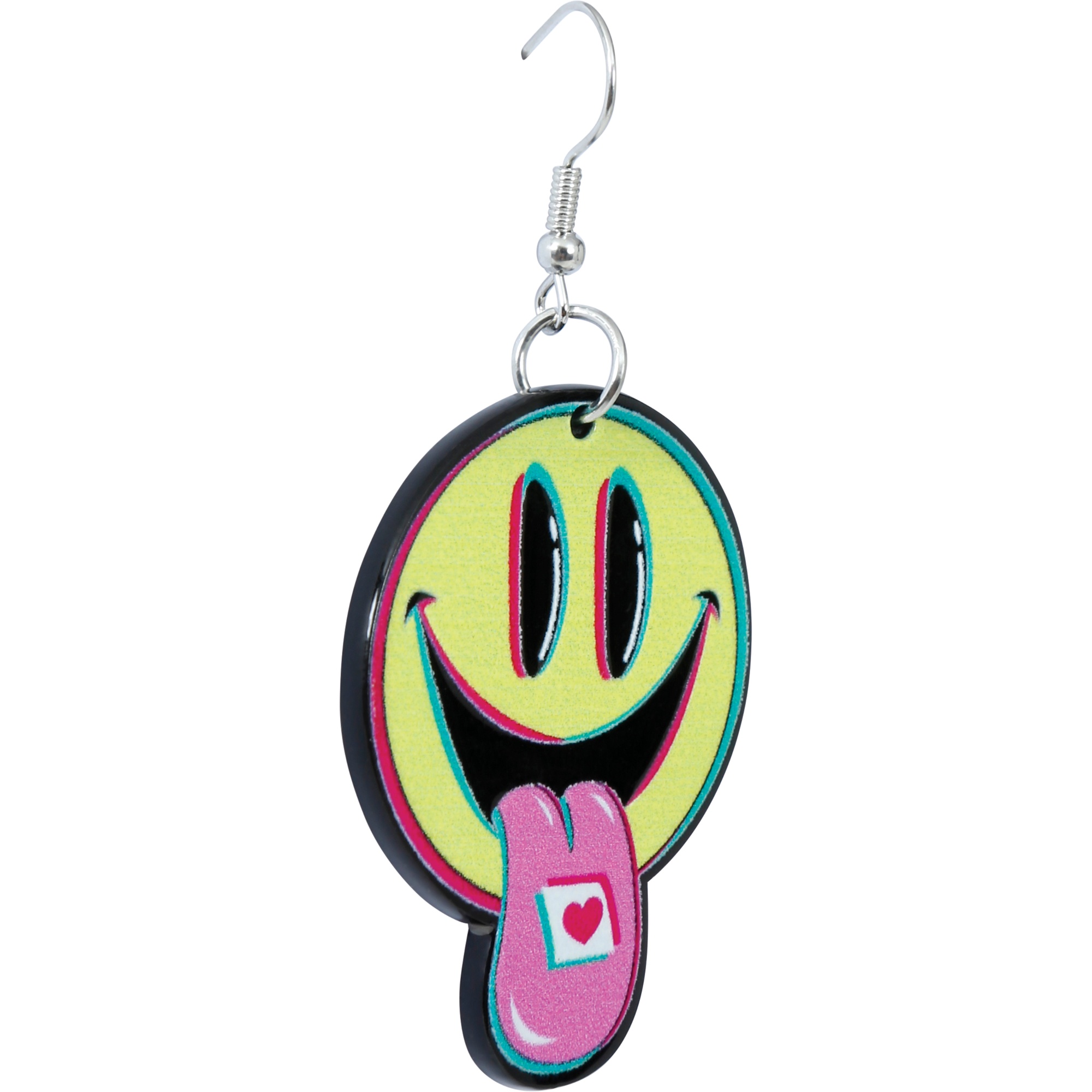 Acid-Ohrringe mit einem Smiley in leuchtenden, acidfarbenen Nuancen, inspiriert von der Ästhetik der 90er. Das auffällige Design verleiht jedem Look einen retrohaften, unbeschwerten Touch.
