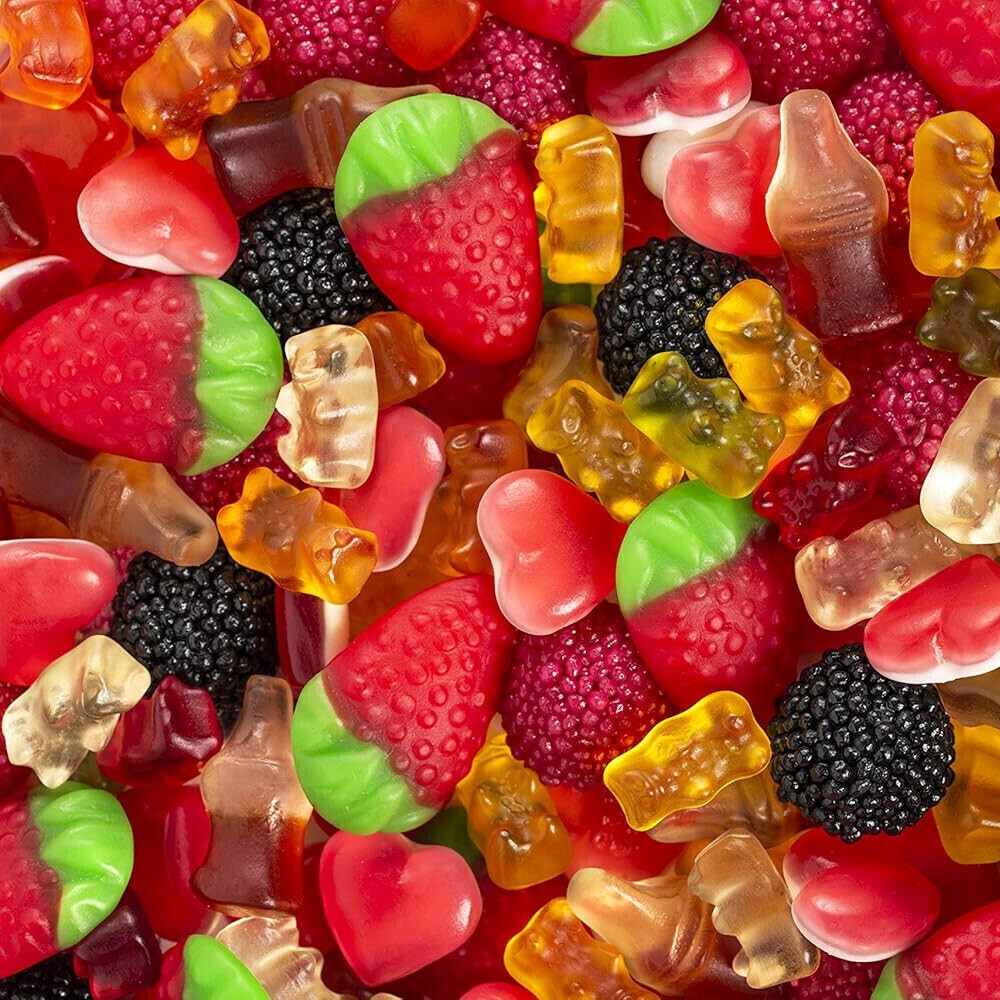 Zutaten: Glukosesirup; Zucker; Wasser; Gelatine; Dextrose; Feuchthaltemittel: Sorbitsirup; Stärke; Säuerungsmittel: Zitronensäure; Fruchtsaft aus Konzentrat: Himbeere, Apfel, Orange, Zitrone, Erdbeere, Ananas; Sonnenblumenöl; Geliermittel: Agar; Aromen; Frucht- und Pflanzenkonzentrate: Schwarze Johannisbeere, Holunderbeere, Aronia, Traube, Rettich, Apfel, Färberdistel, Spirulina, Kiwi, Orange, Zitrone, Mango, Passionsfrucht; Holunderextrakt; Karamellsirup; Farbstoffe: Curcumin, Patentblau V, Holzkohle, Überzugsmittel: Bienenwachs, weiß und gelb.