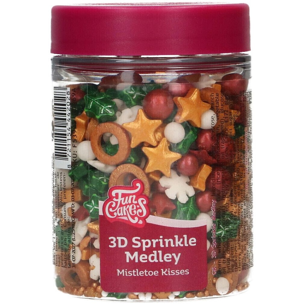 • Die Dekorationsmischung umfasst 3D-Figuren (Sterne, Schneeflocken, Mistelblätter und Kreise), Perlen, Nonpareils, flache Scheiben und Sterne.