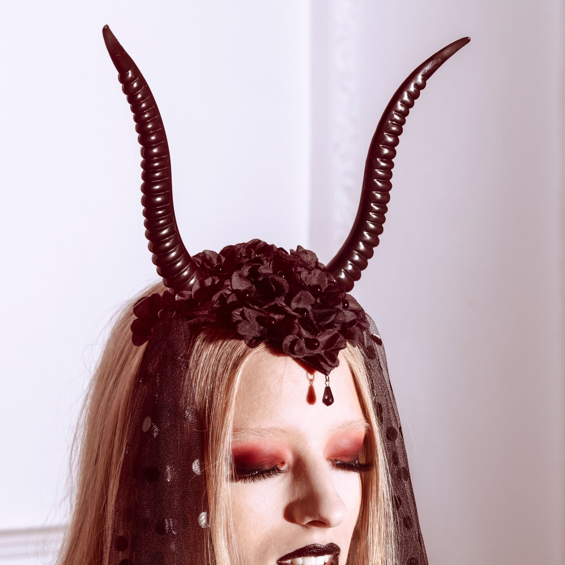 • Stirnband mit Hörnern und schwarzen Blumen, das einen Schleier enthält.