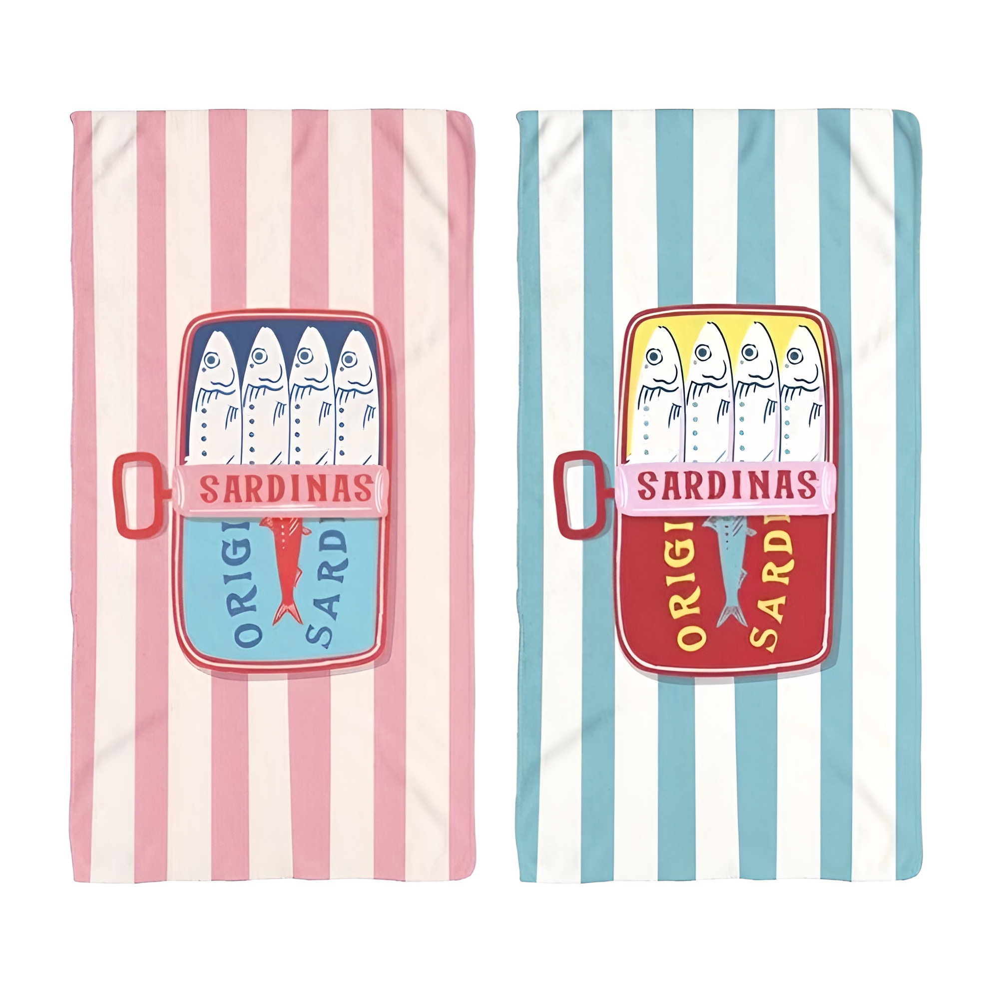 Verleihen Sie Ihren Sonnentagen eine lustige und originelle Note mit diesem Strandtuch im Vintage-Design, inspiriert von Sardinen-Dosen.