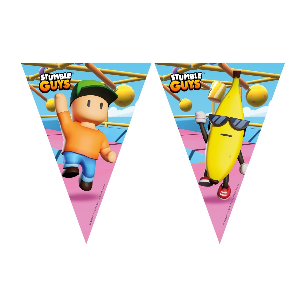 Dekorieren Sie Ihre Feier mit der fröhlichen Optik von Stumble Guys. Dreieckiger Wimpel mit bunten Figuren und auffälligem Design, das Energie und Gaming?Atmosphäre in Kinderpartys bringt. Bedruckt auf Papier mit glänzender Oberfläche, die die Farben lebendig erhält. Packungsinhalt: 1 Stück.