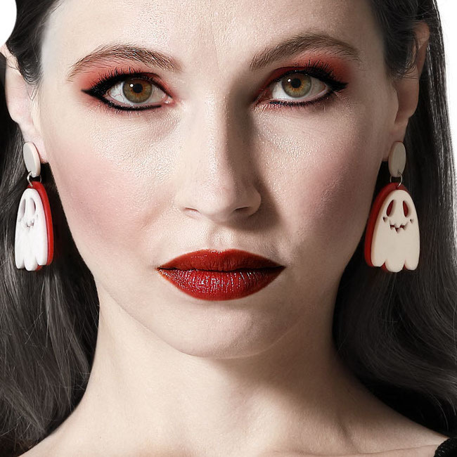 • Ein Paar Ohrringe in Form von Geistern in Rot und Weiß. Lustig und thematisch.