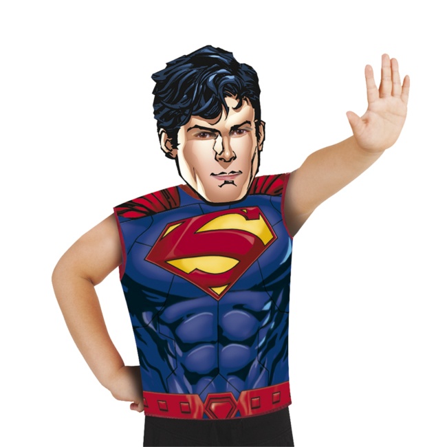 Es handelt sich um ein zweiteiliges Set. Das eine ist das ärmellose T-Shirt, das mit dem Superman-Kostüm und seinen Insignien bedruckt ist. Das andere Teil ist die Pappmaske mit dem Gesicht des Superhelden.