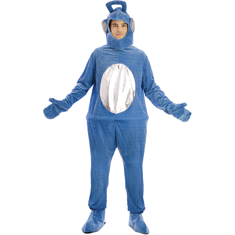 Es handelt sich um ein Kostüm für Erwachsene, das an eine der Figuren der Teletubbies erinnert, nämlich an Tinky Winky.