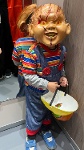 Der Artikel besteht aus einem bunt gestreiften T-Shirt und einer Jeans-Latzhose, die an die Teufelspuppe aus dem Film erinnert.