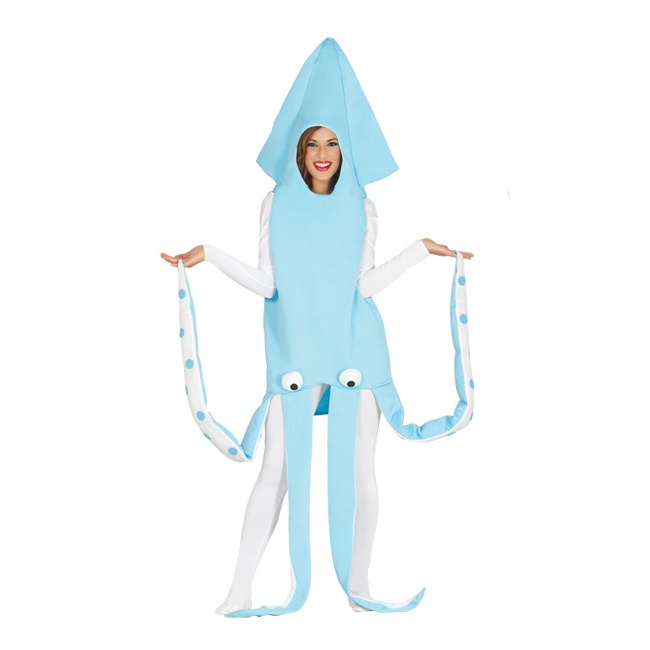Witziges Tintenfisch-Kostüm in blau. Es handelt sich um einen schlauchförmigen Anzug, dessen oberer Teil in einem Schnabel mit zwei Flossen an den Seiten endet. Im unteren Teil hat er zwei Augen und vier gepolsterte Beine, deren Innenseite aus weißen und blauen Kreisen besteht, die Tentakel imitieren.