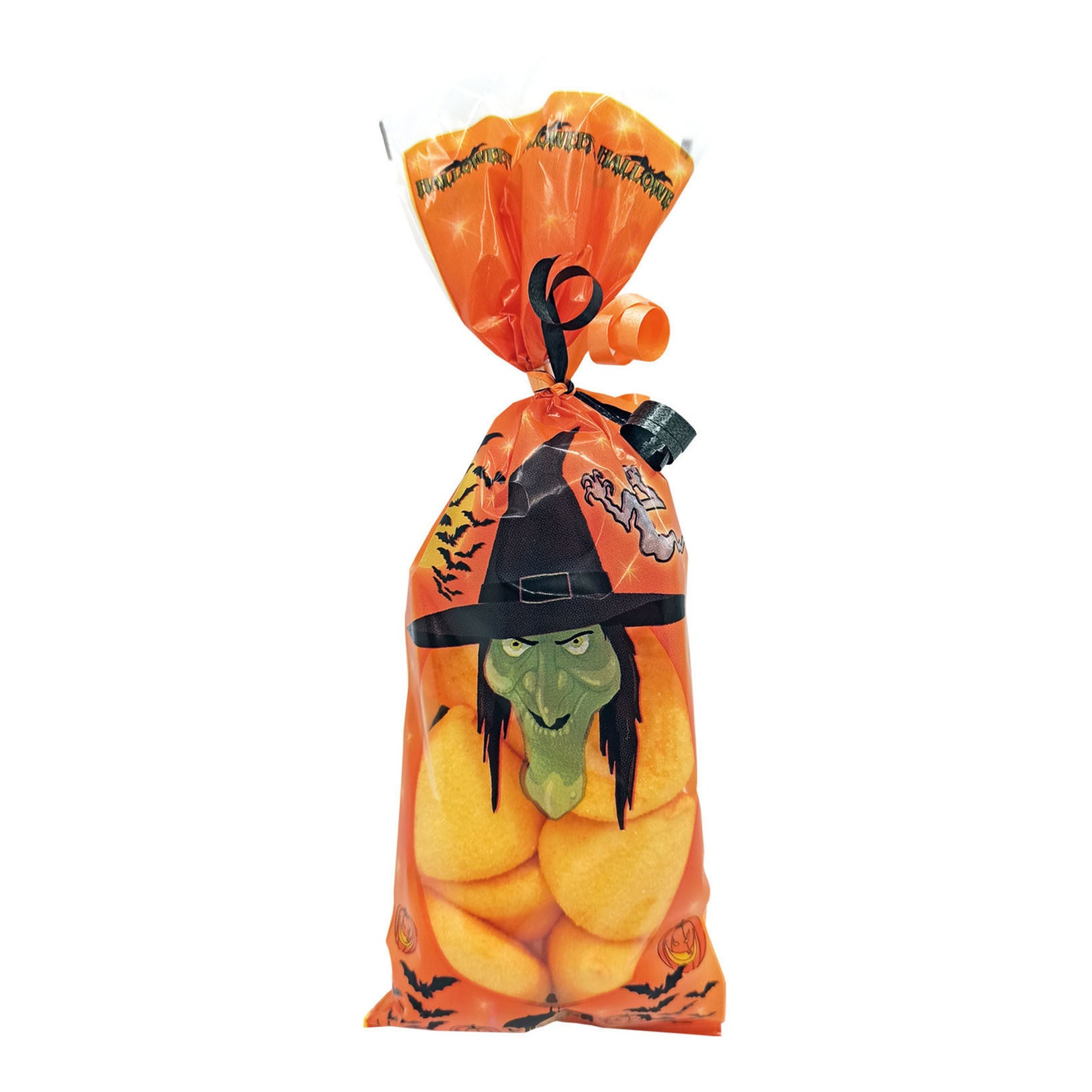 Eine Tüte mit Mäusespeck in Form von Kürbissen, die in einer Plastiktüte mit dem Bild einer grünen Hexe verpackt sind.