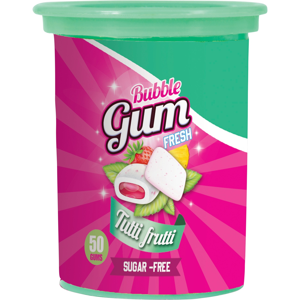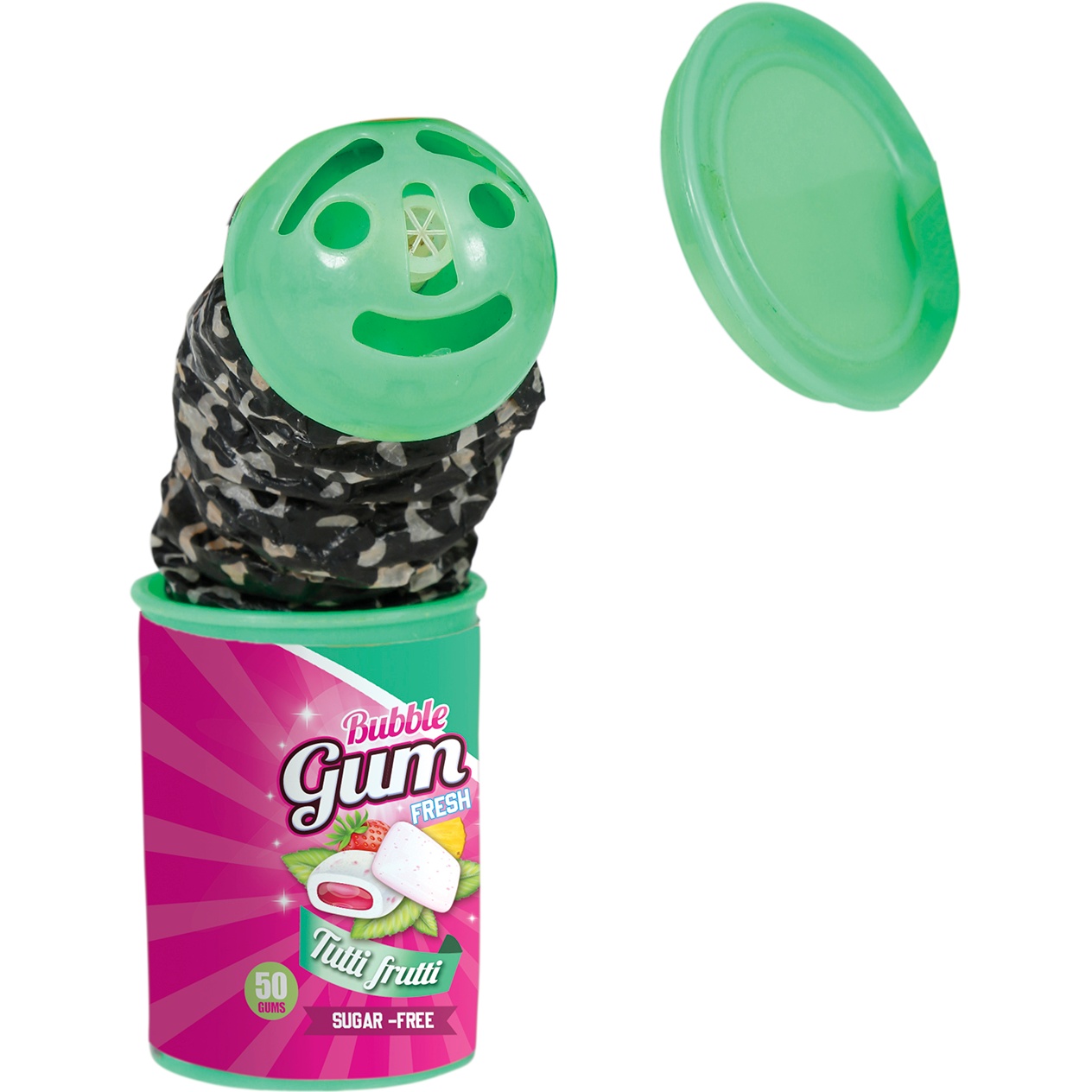 - Auffälliges Design: Latexkopf mit komischem Ausdruck auf einer Kaugummidose.