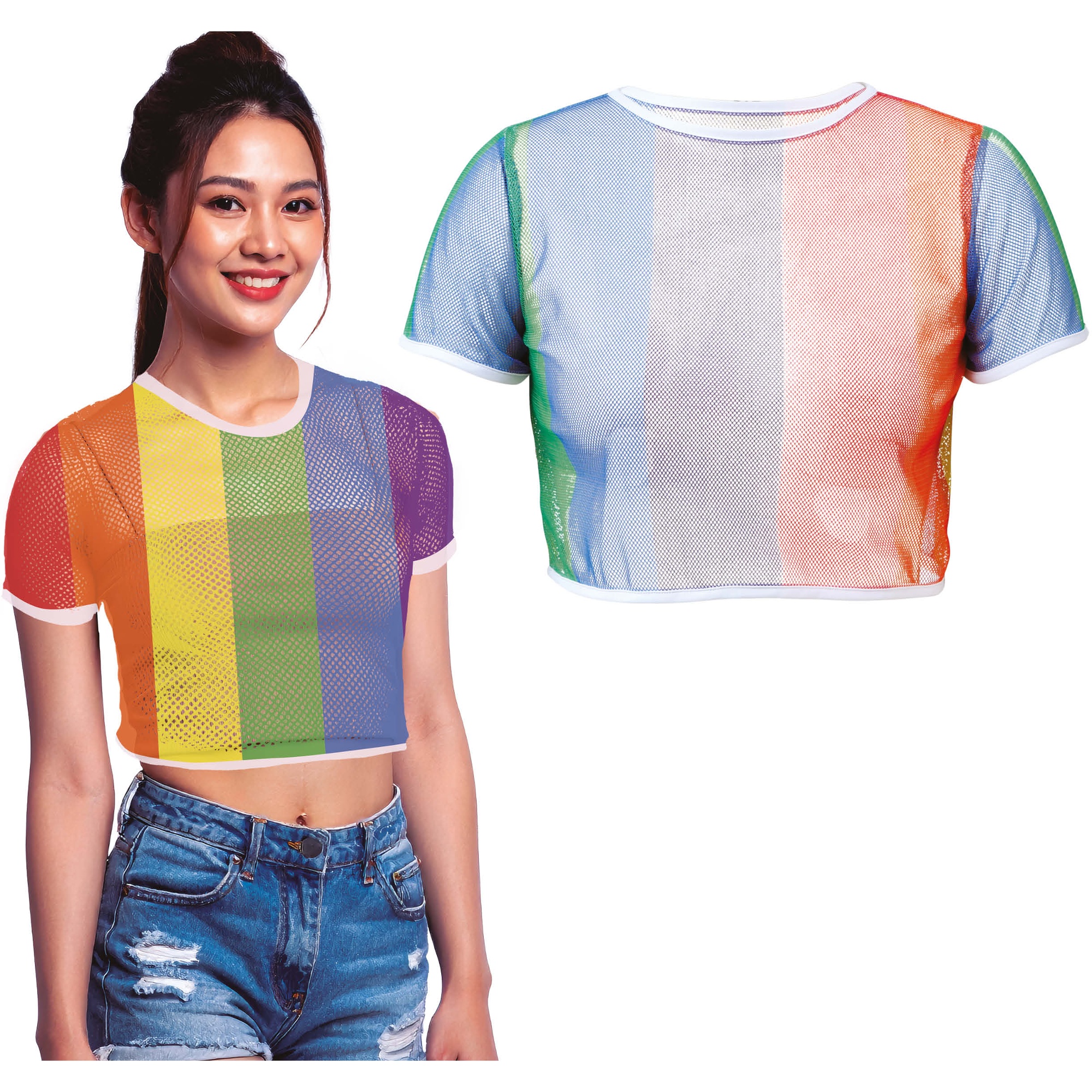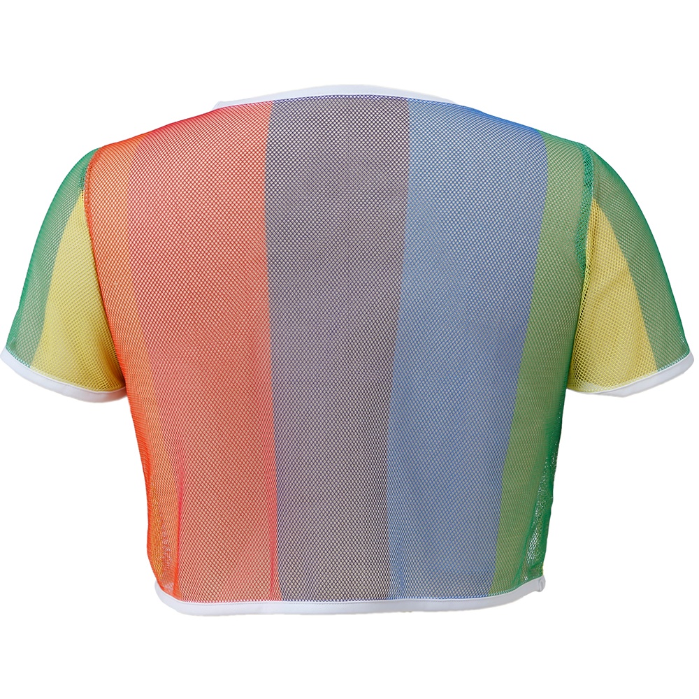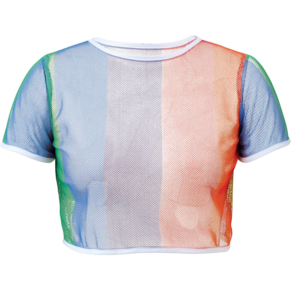 Cropped-Netztop in leuchtenden Regenbogentönen mit halbtransparentem Finish. Der leichte, atmungsaktive Polyesterstoff sorgt für Bewegung und Farbe. Der kurze Schnitt mit weißen Abschlüssen an Kragen und Ärmeln wirkt modern und definiert. Perfekt zum Übereinandertragen über andere Kleidungsstücke, damit Sie auffällige und vielseitige Looks gestalten können. Dieses Kleidungsstück richtet sich an Erwachsene, die einen farbenfrohen und komfortablen Akzent suchen.