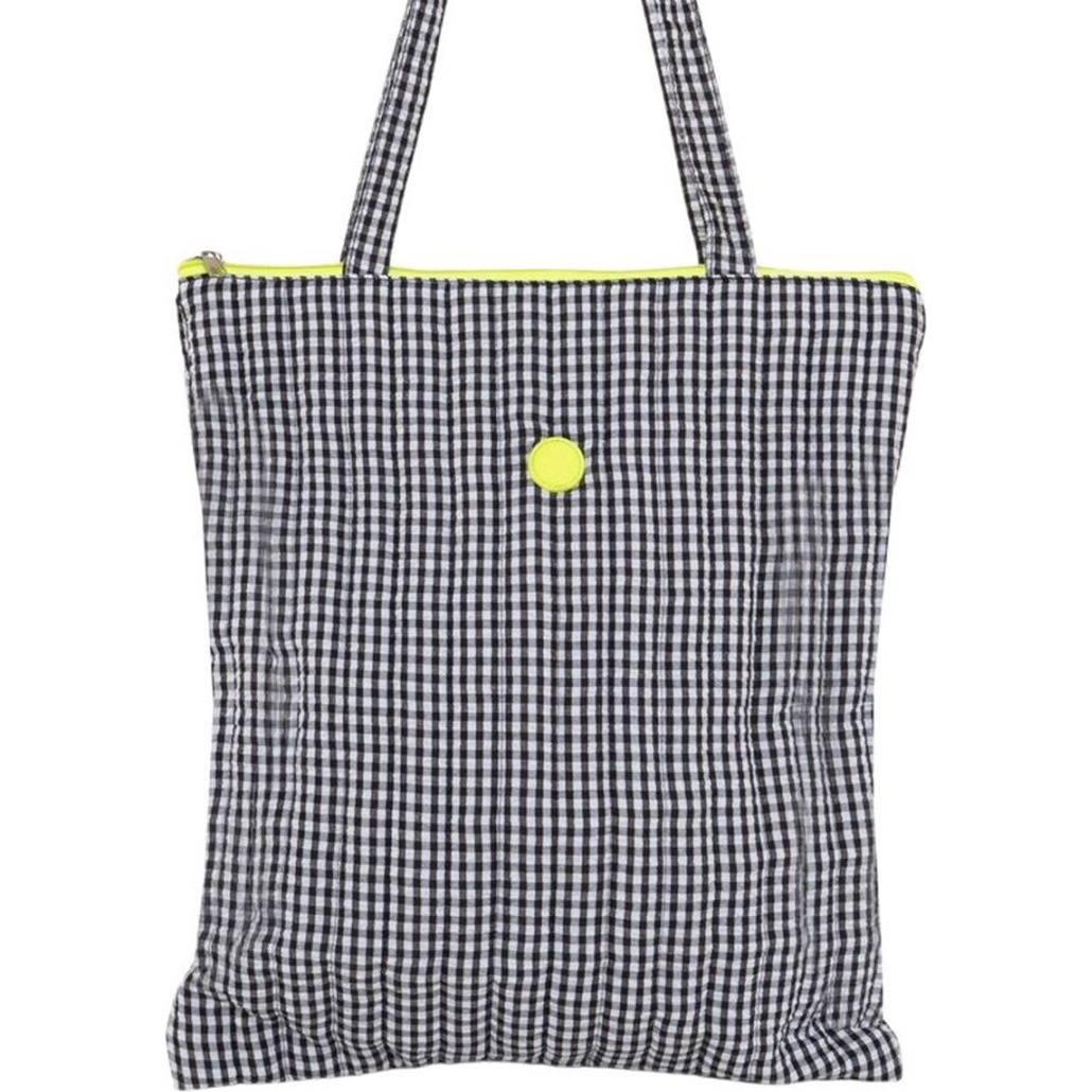 Tote-Bag mit klassischem Vichy-Karo und neonfarbenem Reißverschluss, der einen modernen und auffälligen Akzent setzt.