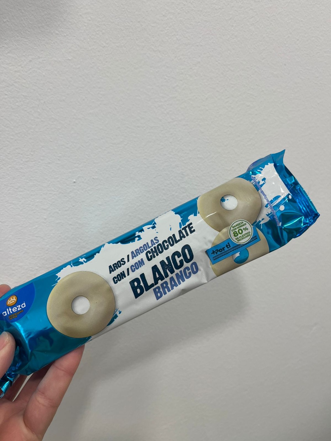 Zutaten: Weiße Schokolade 43% (Zucker, Kakaobutter, Milchpulver, Molkenpulver, Emulgator (Lecithin aus Soja), Aroma, natürliches Vanillearoma), Weizenmehl (Gluten), Zucker, pflanzliches Fett (Palm), entölter Kakao in Pulverform (mit Säureregulator: Kaliumcarbonat), Salz, Treibmittel (Natriumhydrogencarbonat und Ammoniumcarbonat), Emulgator (Lecithin aus Soja).