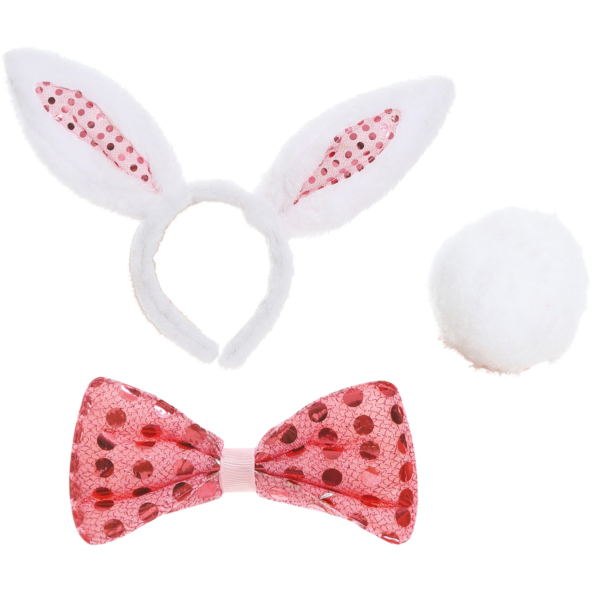 Es hat einen weißen Bommel, kleine Ohren in Form eines Stirnbandes und eine niedliche rosa Fliege mit Pailletten, die dem Kostüm einen anderen und gleichzeitig attraktiveren Touch verleiht.