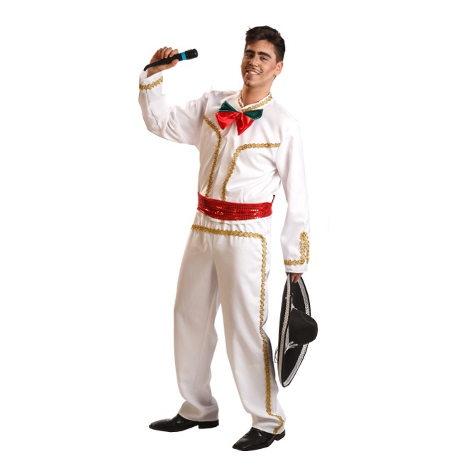 Bestehend aus einer schönen und eleganten weißen kurzen Jacke Anzug mit goldenen Verzierungen und Öffnung in der Front mit Klettverschluss, die perfekt mit der Hose passt, hat diese ein Gummiband an der Taille für eine bessere Passform. Es hat eine schöne rote Paillettenschärpe für die Taille und das zweifarbige Fliegendetail, das ihm einen mexikanischen Look verleiht.