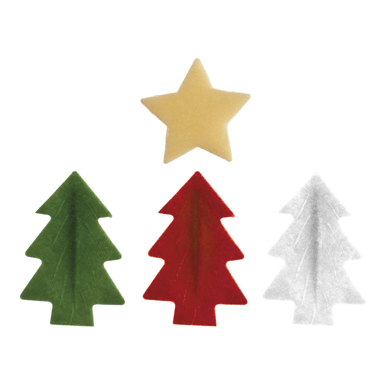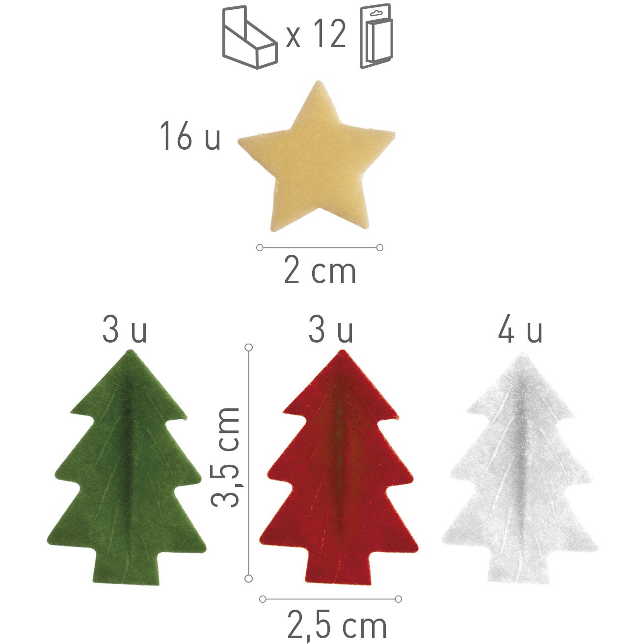 • Enthält: 16 Sterne, 3 grüne Tannen, 3 rote Tannen und 4 weiße Tannen.