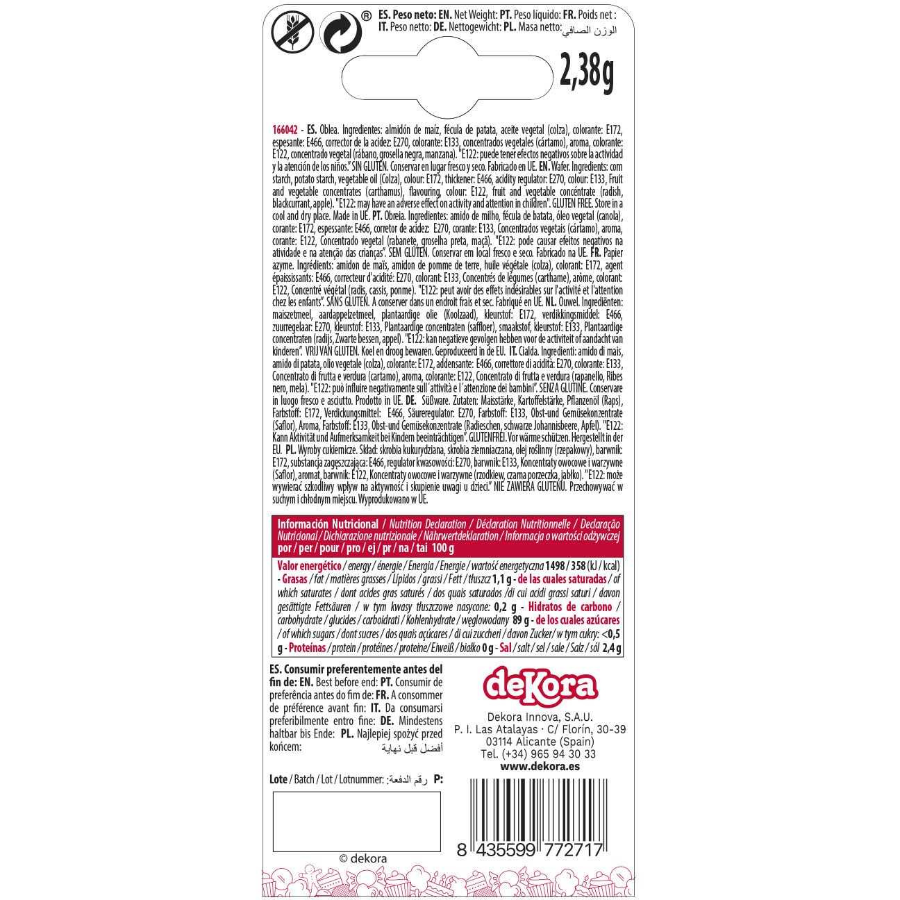Zutaten: Rapsöl, Maisstärke, Kartoffelstärke, Farbstoffe: E122, E133, E172, Säureregulator: E270, Pflanzenkonzentrat: Saflor, Schwarze Johannisbeere, Apfel, Rettich, Aroma: Vanille.
