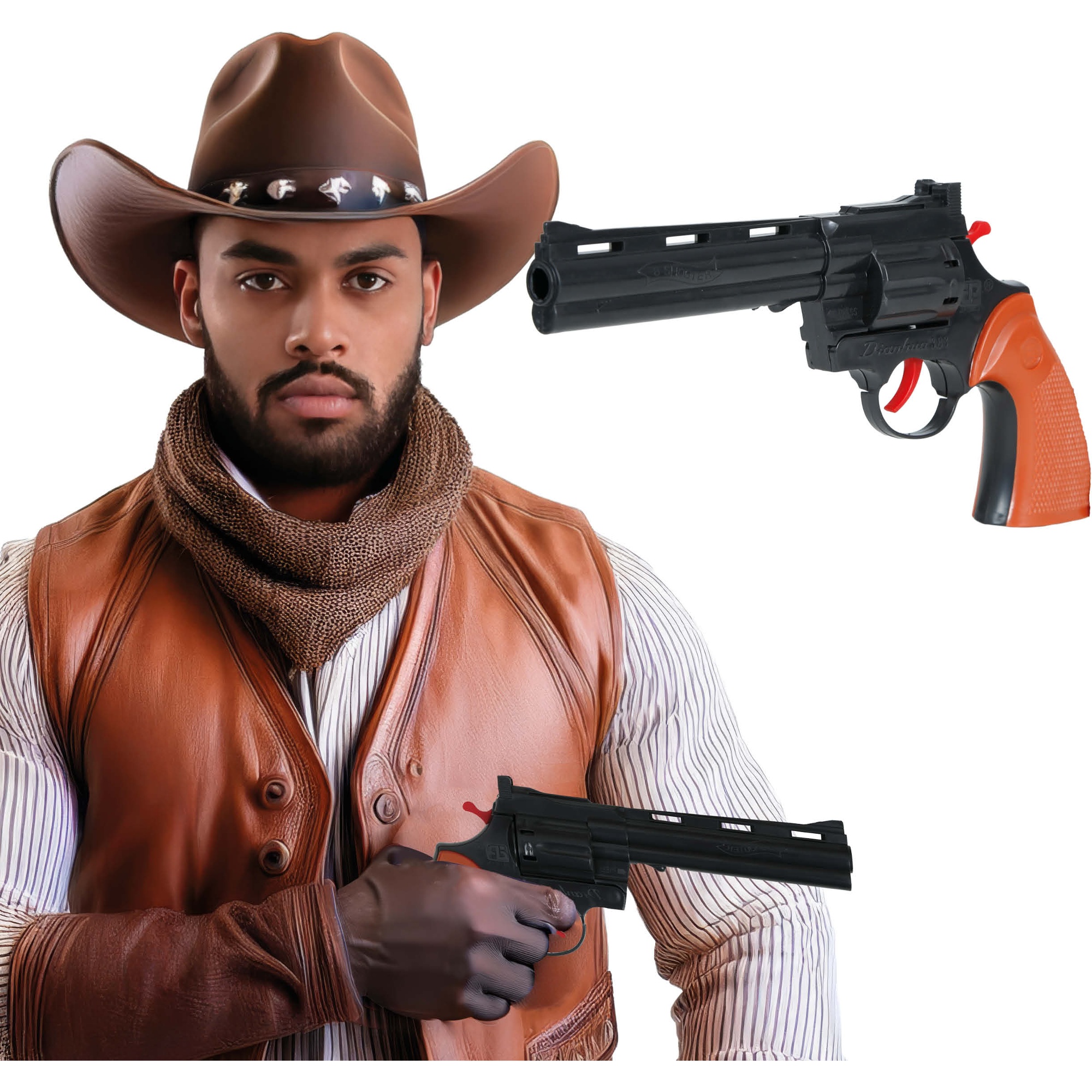 Spielzeugpistole, konzipiert als Ergänzung für Cowboy-Kostüme und Western-Inszenierungen. Aus widerstandsfähigem, leichtem PVC gefertigt und sorgt für ein realistisches Aussehen ohne Gefährdung. Ideal für Karneval, Themenpartys, Fotoshootings und Schulaufführungen. Verwenden Sie sie ausschließlich als Kostümaccessoire; es handelt sich nicht um eine echte Waffe.