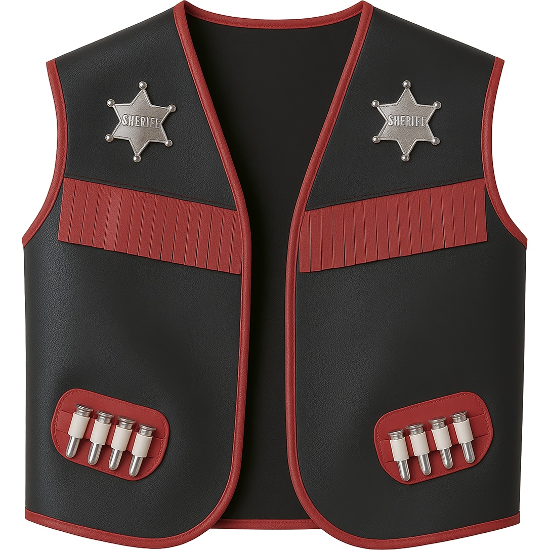 Diese Westernweste für Kinder ist als Ergänzung für Kostüme und Rollenspiele konzipiert. Sie verfügt über eine Kunstleder-Optik mit Fransen und kontrastfarbigen Besätzen, die den Stil des Wilden Westens authentisch nachbilden. Dekorative Sheriff-Abzeichen und kleine Patronentaschen runden das Cowboy-Design ab. Der bequeme, offene Schnitt lässt sich von Ihrem Kind leicht an- und ausziehen; ideal für Karneval, Motto-Partys und schulische Aktivitäten.