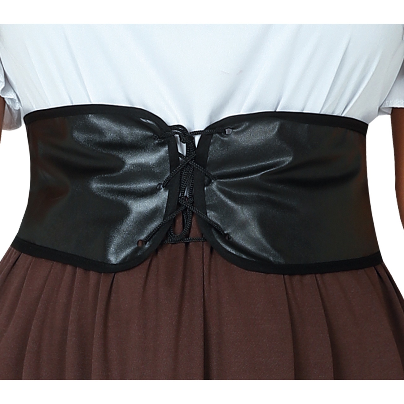 Es hat einen Gummizug in der Taille, damit es gut sitzt, und eine Raffung im Halsausschnittbereich. Es hat einen Gürtel als Korsett. Die Vorderseite ist schwarz mit einem Stoff, der Leder imitiert. Der hintere Teil ist aus Stoff, mit dem man den Knoten macht, um es eng zu machen.